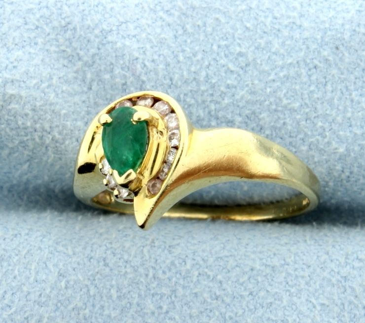 The center is a gem emerald 4mm x 5.5mm pear shape. There are 12 diamonds weighing approx. 0.15 ct TW. The clarity is SI2 and color H-I-J. Size 8. 3.0g