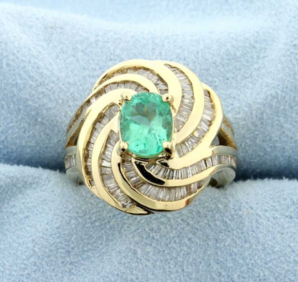The center gem emerald measures 6.5mm x 7.82mm approx. weight 1.5 carats. There are baguette diamonds approx. 1.5 carats with SI-I1 clarity and I-J-K-L color. Ring size 7. Ring measures 3/4" x 3/4". 7.9g