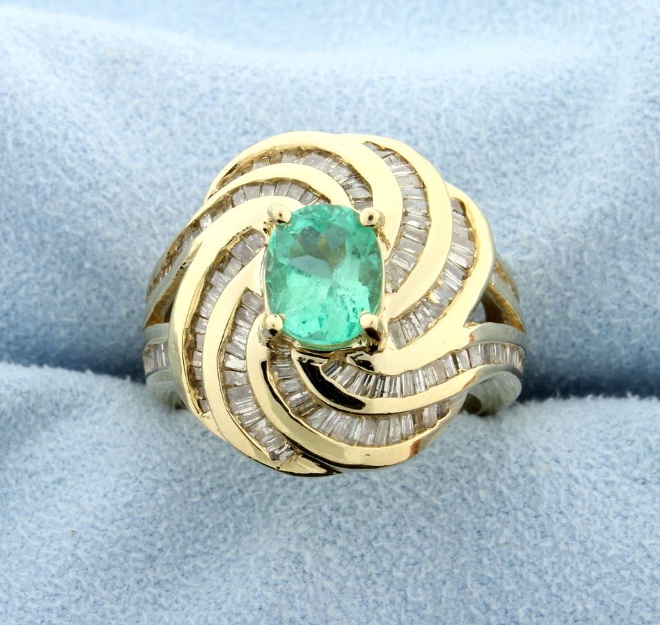 The center gem emerald measures 6.5mm x 7.82mm approx. weight 1.5 carats. There are baguette diamonds approx. 1.5 carats with SI-I1 clarity and I-J-K-L color.  Ring size 7.  Ring measures 3/4" x 3/4".   7.9g