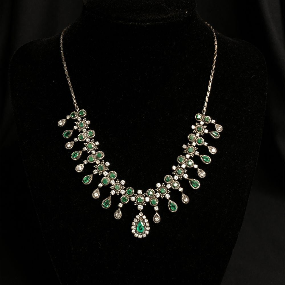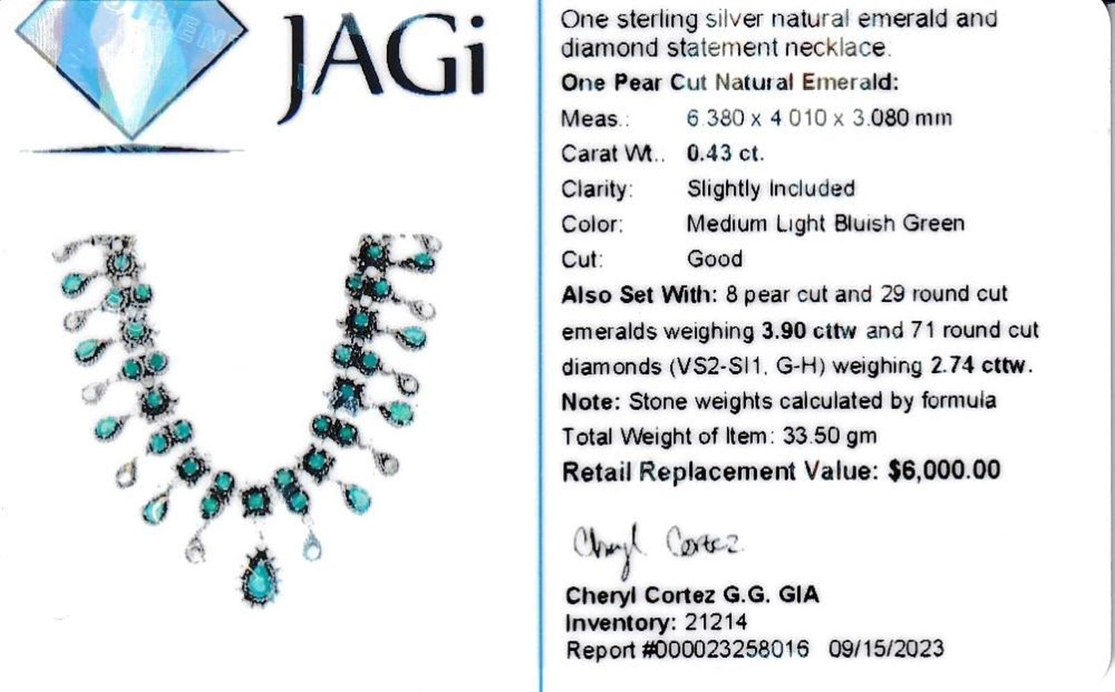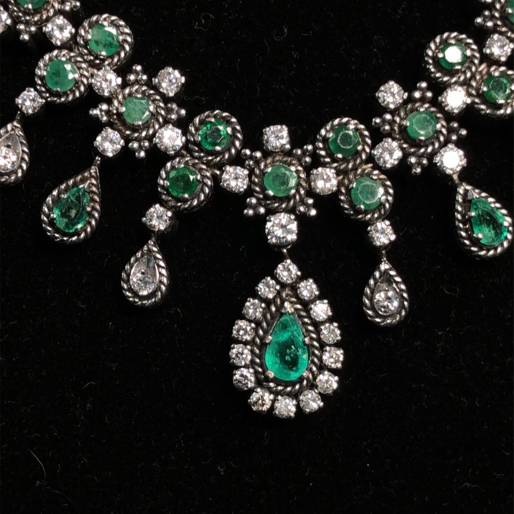 ISPF2065/28 - TYS TITLE DESCRIPTION: Emerald & Diamond Cleopatra-Style Necklace DESCRIPTION DETAIL: A gorgeous bib style necklace set with round and pear shaped Emeralds and round brilliant cut natural Diamonds. OVERALL CONDITION: Very Good Estate Condition. Nice patina, some fine scratches, and very good hinge, clasp, link, and prong condition. STONE: Emerald (Beryl) Shape: Round, Faceted and Pear-Cut Weight: ~4.33 Carats Total Weight Color: Medium, Light Bluish Green DIAMONDS: Natural Shape: Round, Brilliant-Cut Weight: ~2.74 Carats Total Weight Color: G-H Clarity: VS2-SI1 METAL: Sterling Silver WEIGHT: 33.5 Grams SIZE: 16" APPRAISAL DETAILS: This necklace is certified and appraised by JAGI (Jewelry Appraisal and Gemological Institute) for $6,000.00 estimated retail replacement value. THIS ITEM IS FROM AN ORDERED LIQUIDATION OF A MAJOR JEWELRY MANUFACTURER'S OVERSTOCKED INVENTORY. PRIOR TO BIDDING READ THE DESCRIPTION, TERMS, AND CONDITIONS CAREFULLY This description and condition report is provided for your convenience based on the information provided by the consignor. CAA is not responsible for any discrepancies between this information and other opinions. Buyers Premium: 18% Payment Due in 5 days All items shipped to registered address - NO EXCEPTIONS ISPF2065/28 - TYS