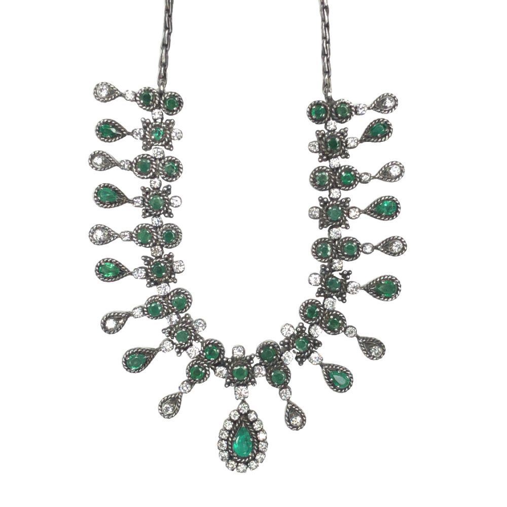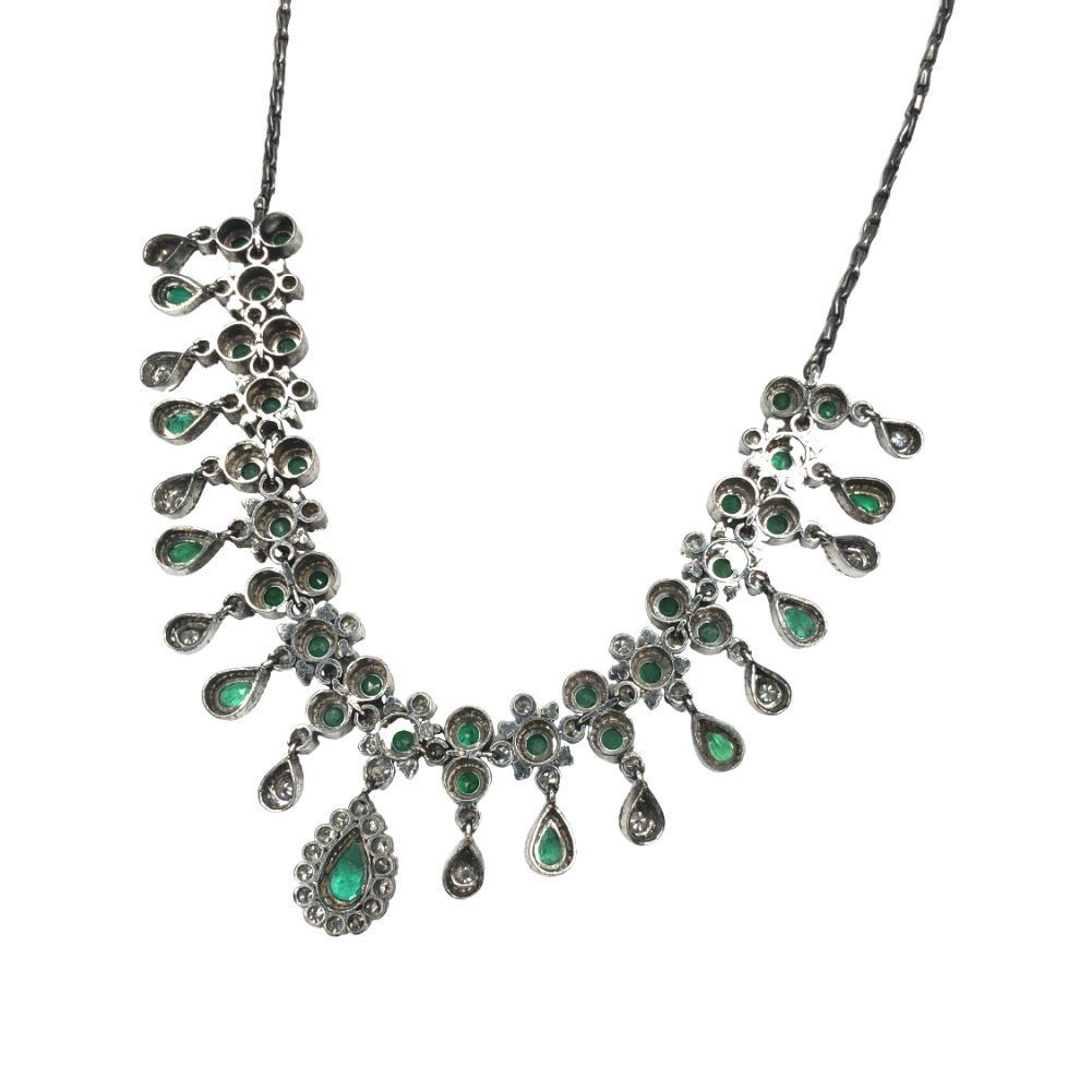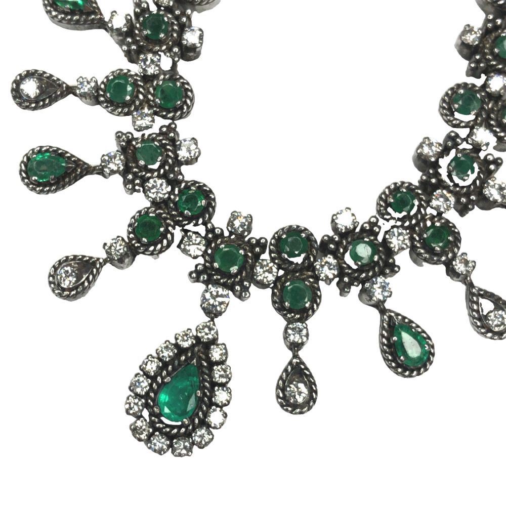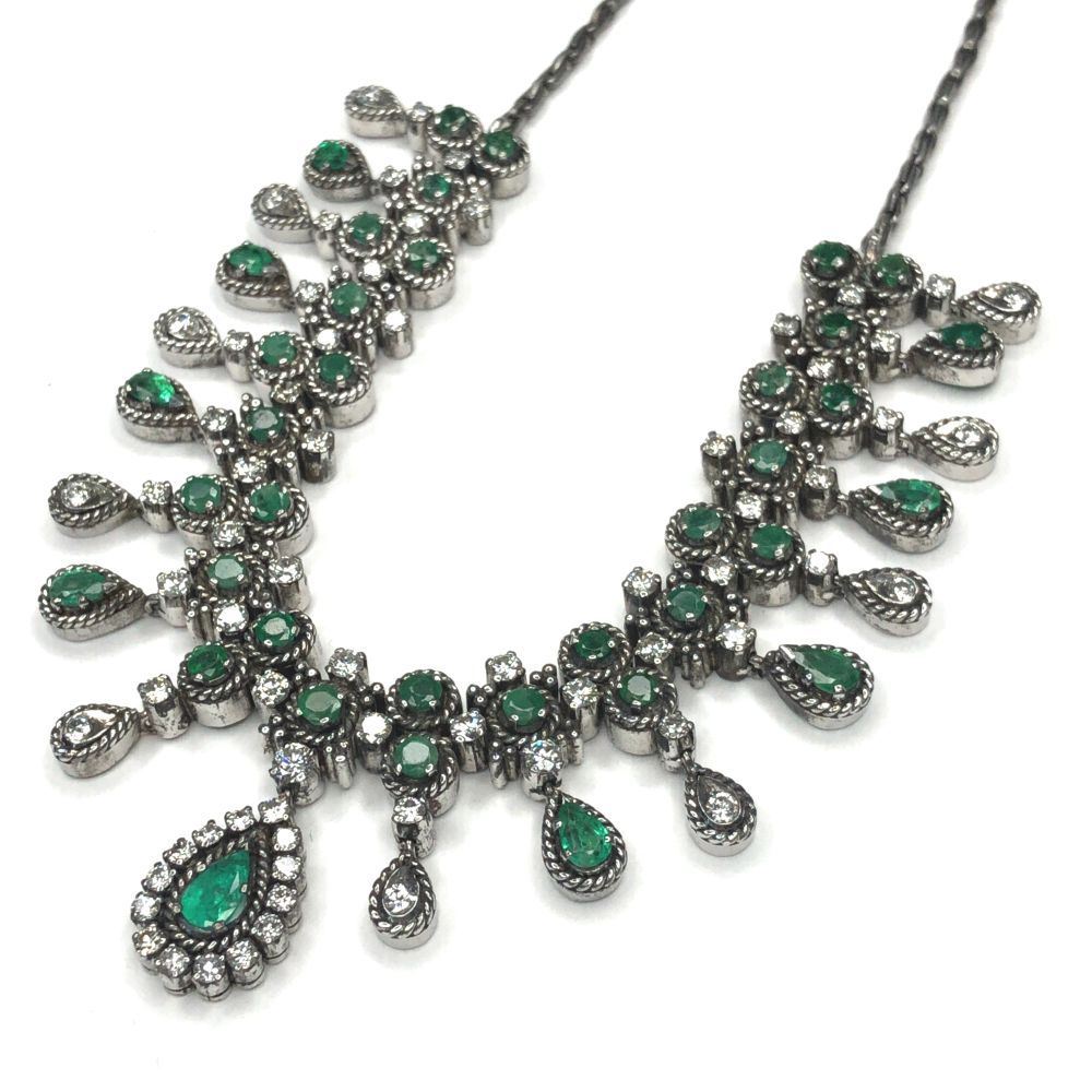 ISPF2065/28 - TYS TITLE DESCRIPTION: Emerald & Diamond Cleopatra-Style Necklace DESCRIPTION DETAIL: A gorgeous bib style necklace set with round and pear shaped Emeralds and round brilliant cut natural Diamonds. OVERALL CONDITION: Very Good Estate Condition. Nice patina, some fine scratches, and very good hinge, clasp, link, and prong condition. STONE: Emerald (Beryl) Shape: Round, Faceted and Pear-Cut Weight: ~4.33 Carats Total Weight Color: Medium, Light Bluish Green DIAMONDS: Natural Shape: Round, Brilliant-Cut Weight: ~2.74 Carats Total Weight Color: G-H Clarity: VS2-SI1 METAL: Sterling Silver WEIGHT: 33.5 Grams SIZE: 16" APPRAISAL DETAILS: This necklace is certified and appraised by JAGI (Jewelry Appraisal and Gemological Institute) for $6,000.00 estimated retail replacement value. THIS ITEM IS FROM AN ORDERED LIQUIDATION OF A MAJOR JEWELRY MANUFACTURER'S OVERSTOCKED INVENTORY. PRIOR TO BIDDING READ THE DESCRIPTION, TERMS, AND CONDITIONS CAREFULLY This description and condition report is provided for your convenience based on the information provided by the consignor. CAA is not responsible for any discrepancies between this information and other opinions. Buyers Premium: 18% Payment Due in 5 days All items shipped to registered address - NO EXCEPTIONS ISPF2065/28 - TYS