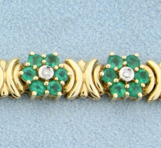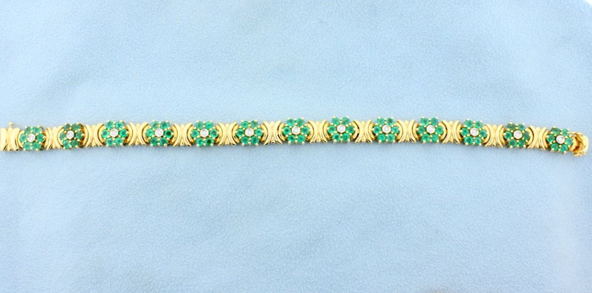 In 14K yellow gold, the bracelet is 7 1/4 inches long and has a safety clasp. It contains seventy eight 2.5mm round emeralds for a total weight of 4.5ct- they all have excellent color and clarity. Also there are thirteen .01ct diamonds. 20.9g