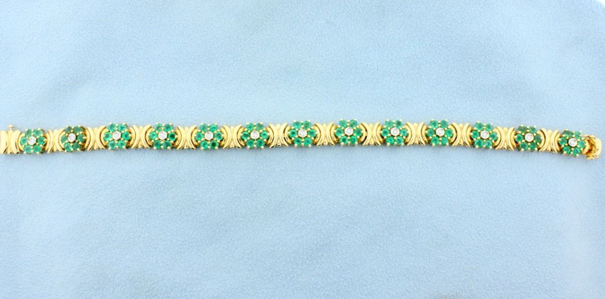 In 14K yellow gold, the bracelet is 7 1/4 inches long and has a safety clasp. It contains seventy eight 2.5mm round emeralds for a total weight of 4.5ct- they all have excellent color and clarity. Also there are thirteen .01ct diamonds. 20.9g