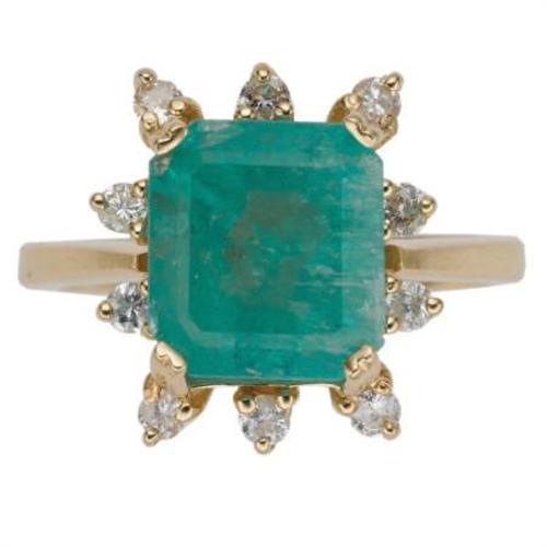 <B>Emerald, Diamond, Gold Ring</B></I><BR><BR>The ring centers an emerald-cut emerald measuring approximately 9.60 x 8.80 mm and weighing approximately 4.00 carats, surrounded by full-cut diamonds weighing a total of approximately 0.30 carat, set in 14k yellow gold. Gross weight 5.50 grams.<BR>Note: 6 (sizeable)<BR><BR> <B>Condition Report:</B> Very good condition. Featured emerald is loose.<BR><BR><b>Shipping:</b> Miscellaneous Collectibles, Smal (<a target="_blank" href="http://www.heritageauctions.com/common/shipping.php">view shipping information</a>\)