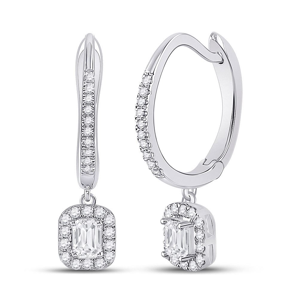 14kt White Gold Womens Emerald Diamond Hoop Dangle Earrings 1/2 Cttw