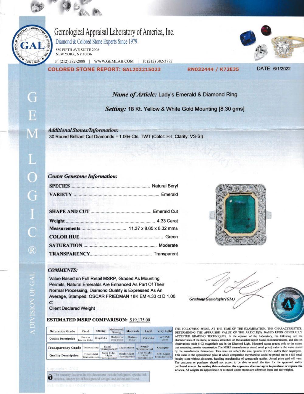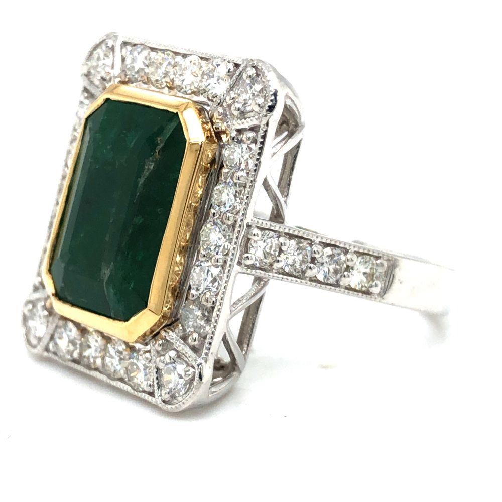 ADDITIONAL INFORMATION: Designed by Oscar Friedman, an emerald-cut (with truncated corner, making it octagonal) is bezel-set with a& nbsp; yellow gold bezel and bezel cup, in a white gold ring.& nbsp; The fitting diamond halo has trimmed-out corners, and a continuous milgrain edging that continues to the diamond shoulders.& nbsp; The ring has ornate and supportive galleries.& nbsp; The Oscar Friedman hallmark appears on the inside of the ring shank.& nbsp; This emerald, like most emeralds, has inclusions, some of which contain schist and reach the surface. And, as stated on the appraisal, like other jewelry quality emeralds, this emerald also received enhancement in accordance to the inclusion types.& nbsp; Please see photos, as they are considered part of the item description.