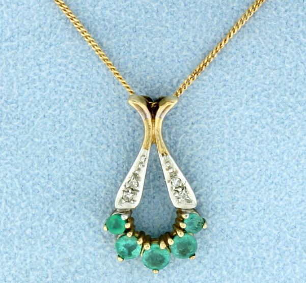 Stamped 375, this 9K yellow gold pendant contains three 3mm & two 2.5mm round emeralds that have great color & clarity. Also it contains four 1/2pt diamond. The chain is 18 inches long and the pendant is about 1 inch pendant. 2.2g