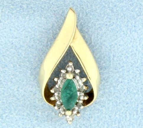 In 10K yellow gold, there is one 6x3mm marquise emerald and seven 1/2pt round diamonds. The pendant is 7/8 inch long. 1.8g