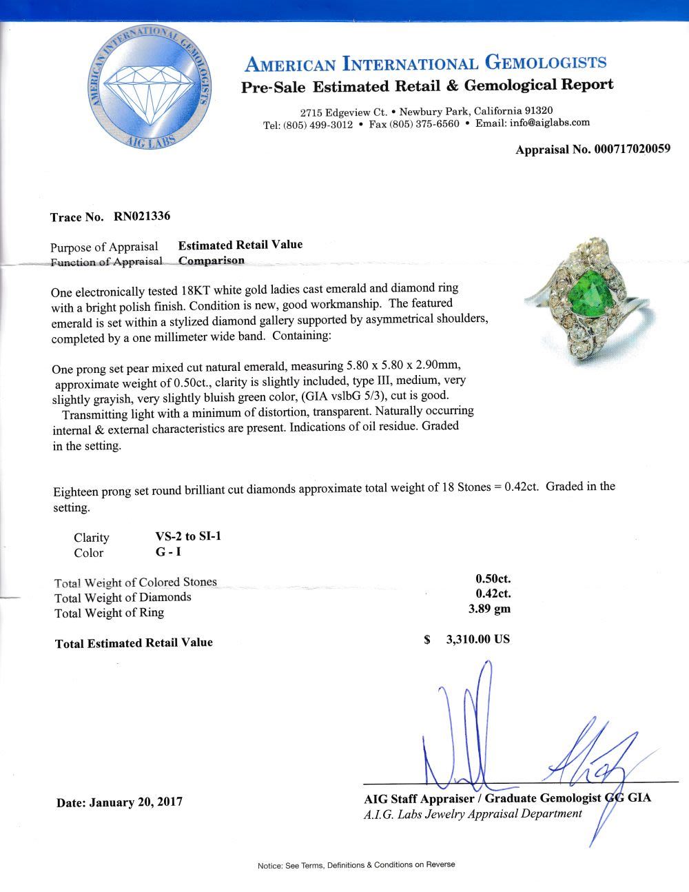 APPRAISAL REPORT: This ring is certified and appraised for& nbsp; $3,310.00 estimated retail replacement value by American International Gemologists (AIG).