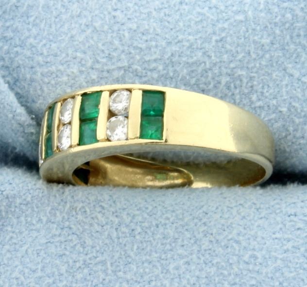 In 14K yellow gold, this ring contains eight .05ct very high quality round diamonds that are Vs clarity/F color. Also this ring contain ten 2mm square natural emeralds that are also very high quality-excellent color and clarity! Size 6 3/4       3.5g