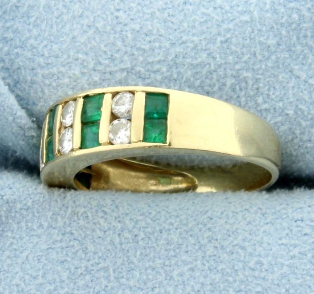 In 14K yellow gold, this ring contains eight .05ct very high quality round diamonds that are Vs clarity/F color. Also this ring contain ten 2mm square natural emeralds that are also very high quality-excellent color and clarity! Size 6 3/4 3.5g
