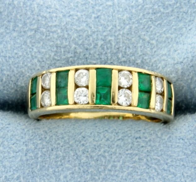 In 14K yellow gold, this ring contains eight .05ct very high quality round diamonds that are Vs clarity/F color. Also this ring contain ten 2mm square natural emeralds that are also very high quality-excellent color and clarity! Size 6 3/4 3.5g