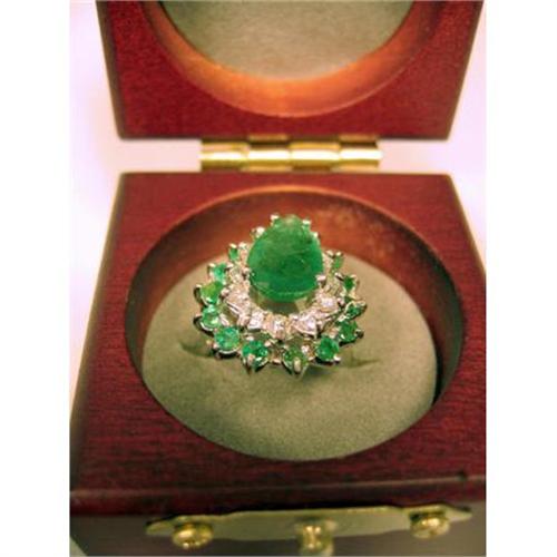 "Womens 18kt.white gold and natural emerald and diamond cocktail ring.Ring is set with medium green,transparent pear shape emerald weighing 3.00 carats.It is surrounded by 15 round emeralds weighing 1.00 carat and 12 round G-H/SI