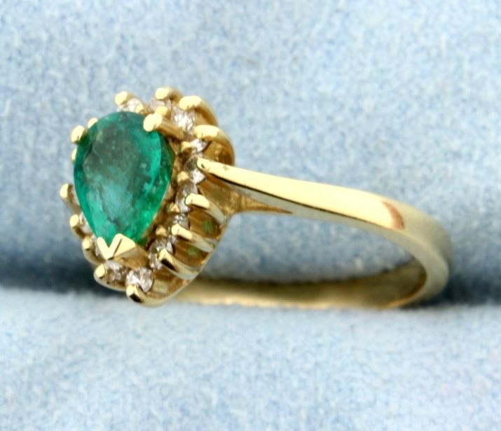 Great Emerald and diamond Halo style ring set in 14k yellow gold. The Emerald weighs 0.80 carats and is a great pear shape. The emerald color is excellent and we believe it to be of Zambian origin. There are 15 brilliant cut diamonds that weight 0.50 carats. Diamonds are SI clarity and H-I color. Size 6 3.6g