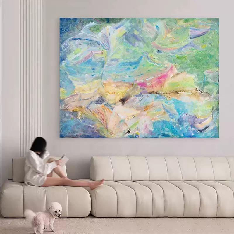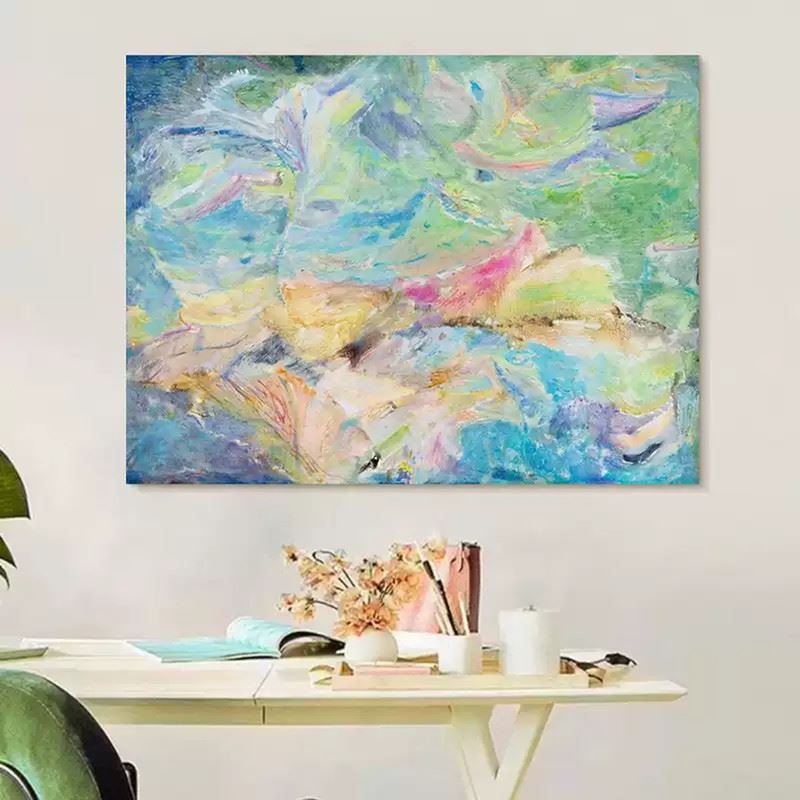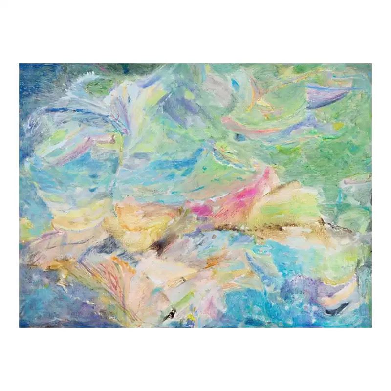 Soft emerald greens mingle with pale pinks and yellows, like feather-light leaves brushed by a spring breeze, drifting slowly through the light. Dimensions: 31 x 24 inches.