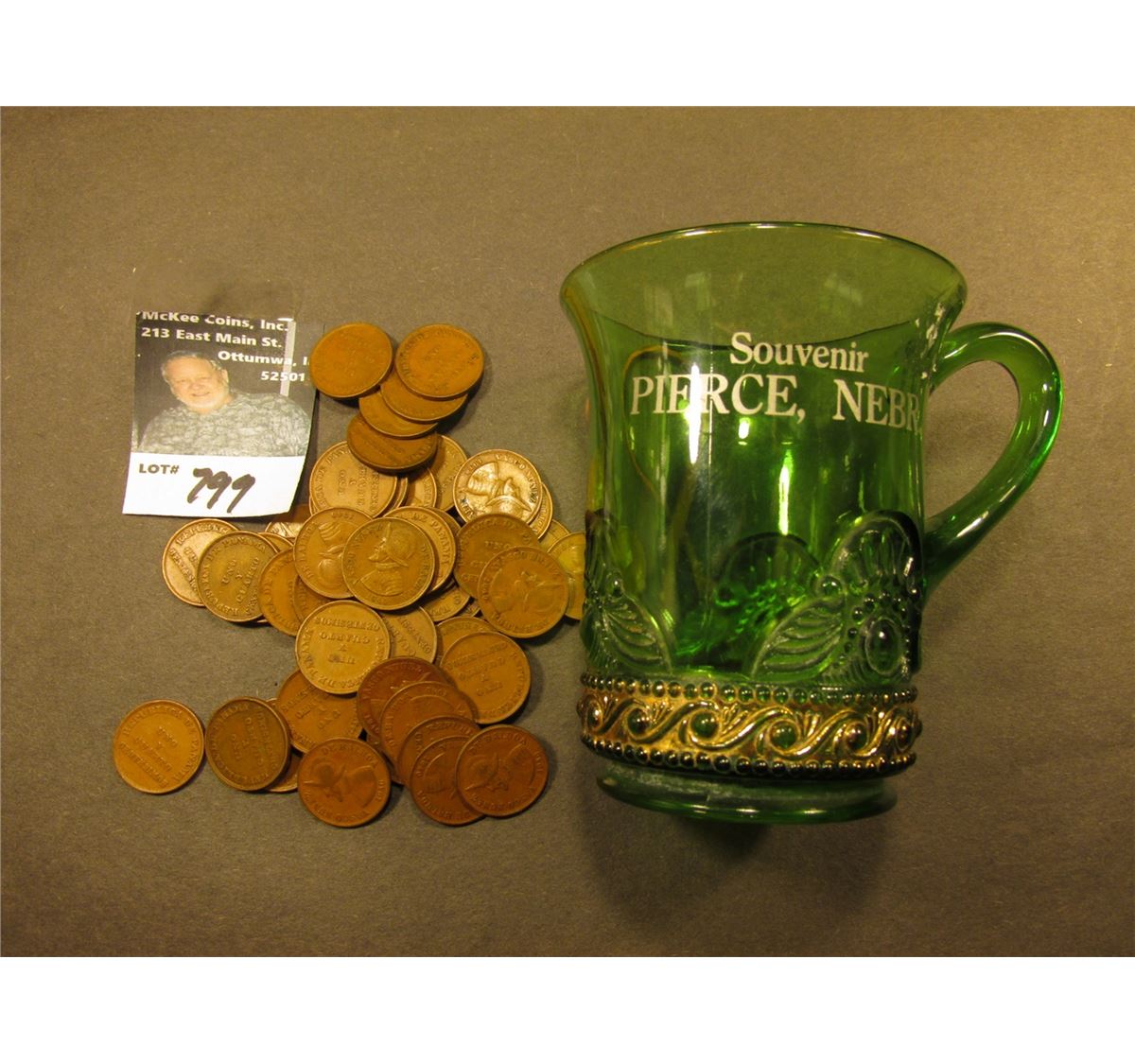 Emerald Glass Mug with Goldine base marked "Souvenir of Pierce, Nebr." with (51) Old 1940 era Panama Coins.