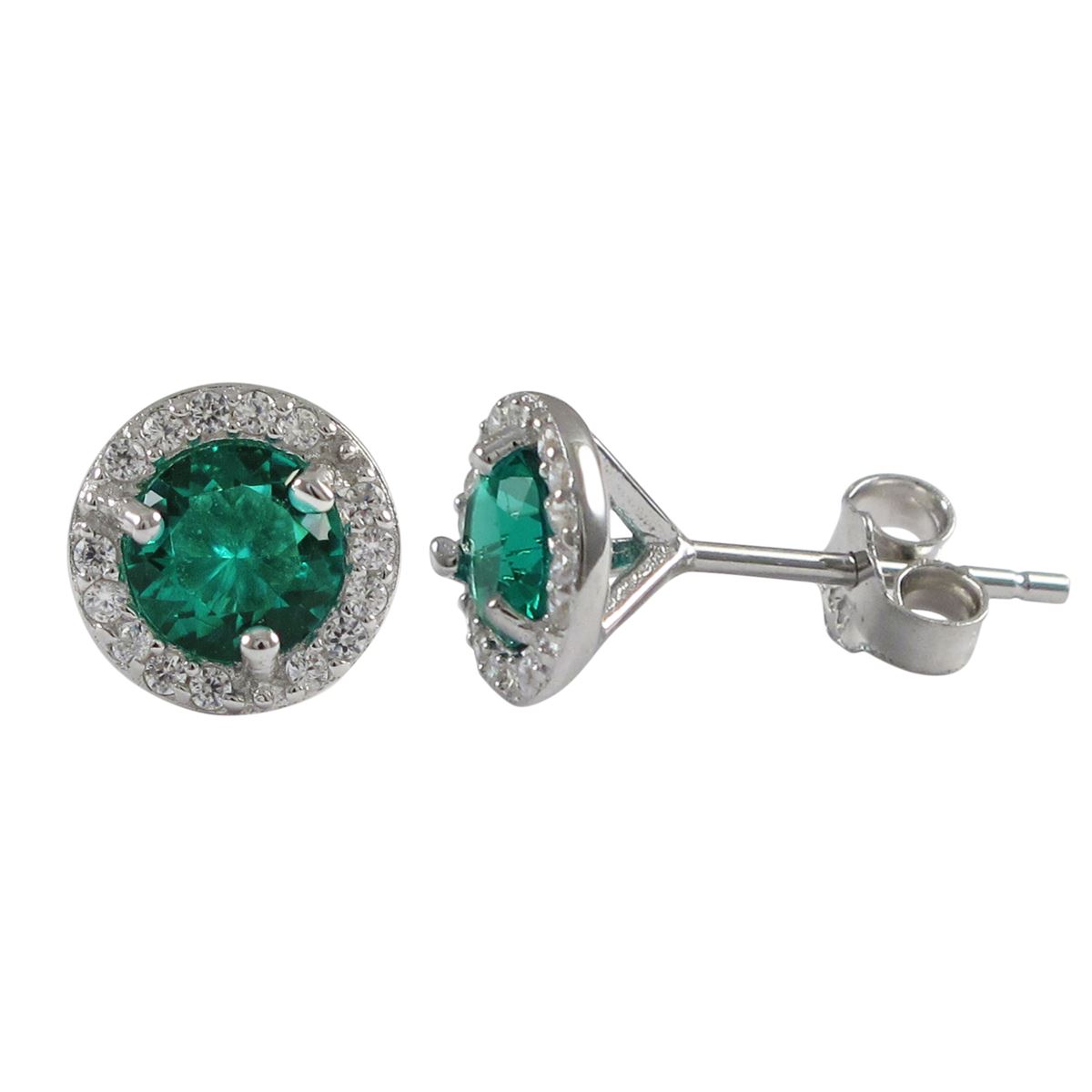 Emerald Green 5Mm Round CZ With White CZ Border, Rhodium Plated Sterling Silver 8Mm Round Post Stud Earrings