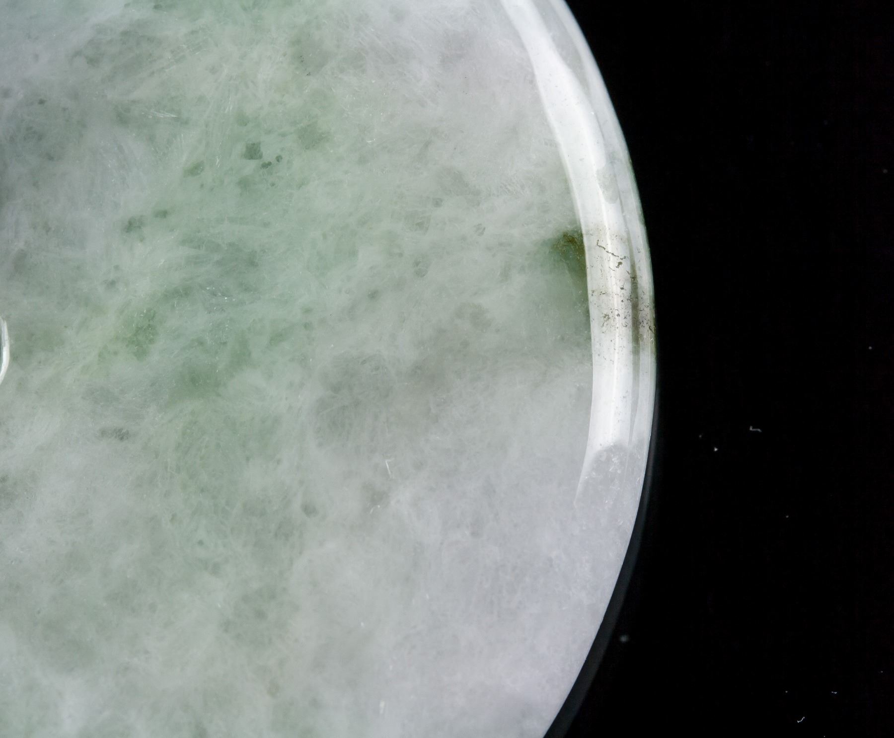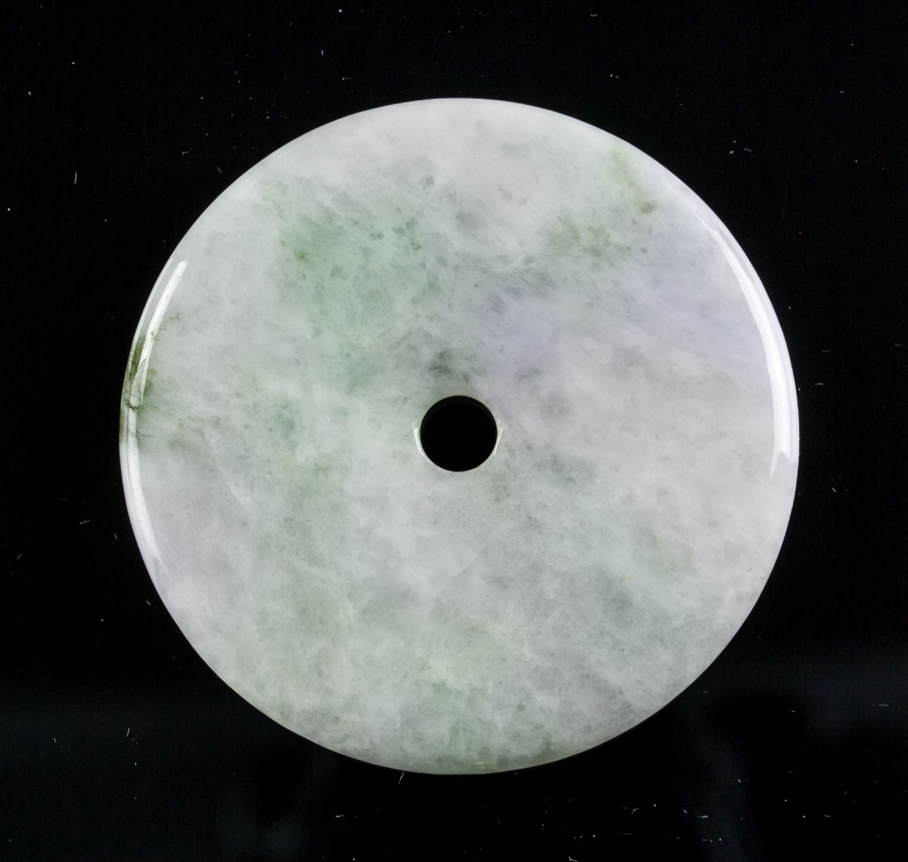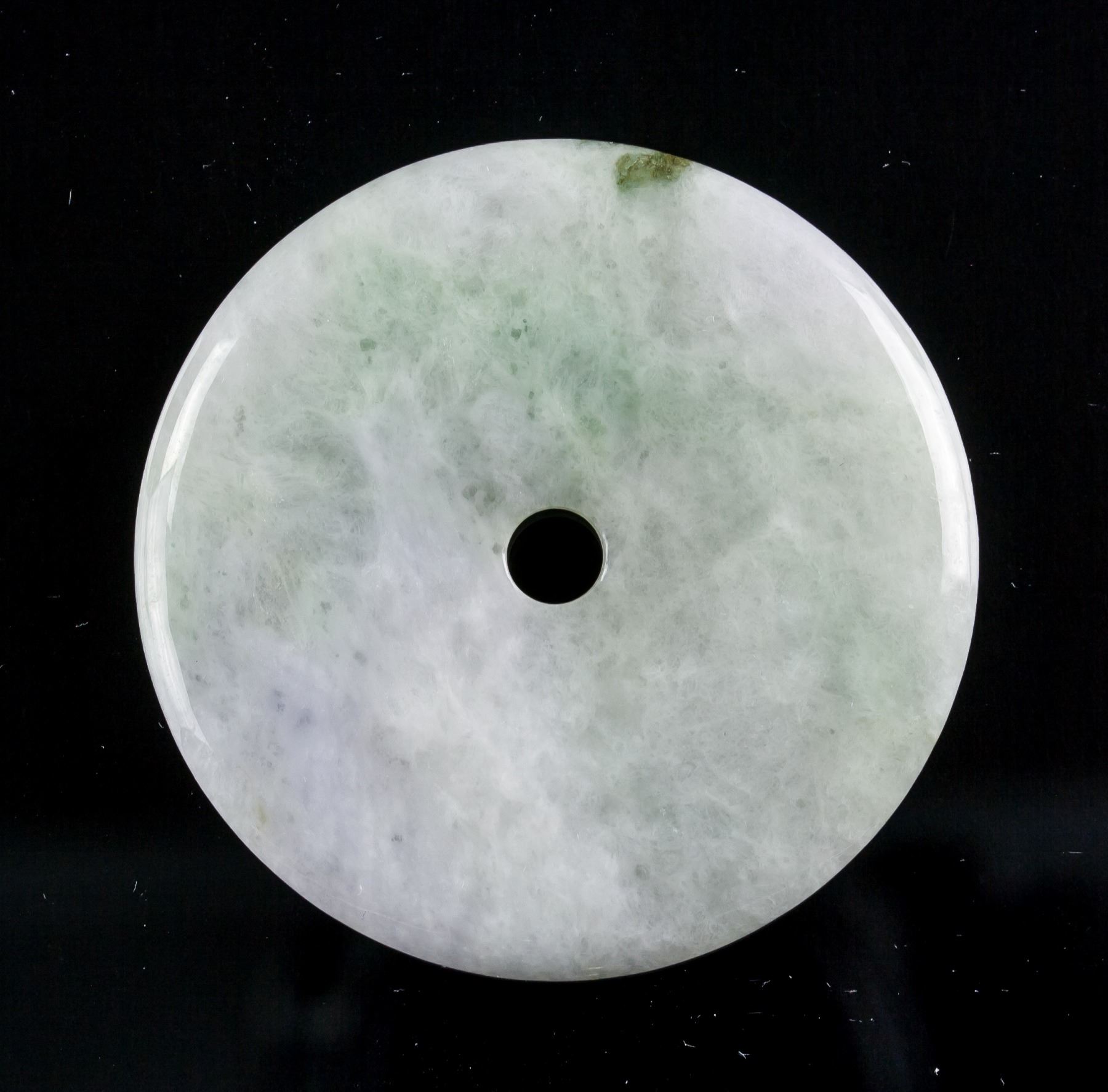 Emerald green jadeite carved bi disc pendant. Density: 3.31, 31 grams. PROVENANCE: Private collection (Nagoya, Japan)
