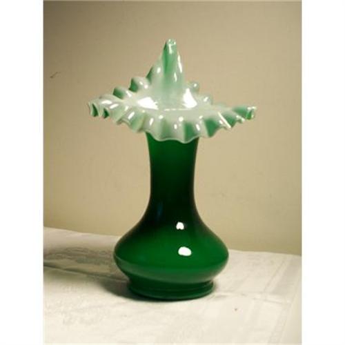 This is a stunning Jack-in-pulpit vase, emerald green with the top a pale sea foam green. The top of the vase the edges are crimped and very stylish. <P> The lovely piece is nine and one-half inches in height and is six inches across the top, the base is three inches. <P> The piece is not marked, but I believe this is an older piece of Fenton, that was paper labeled. <P> The vase is in mint condition with no chips or cracks, and is