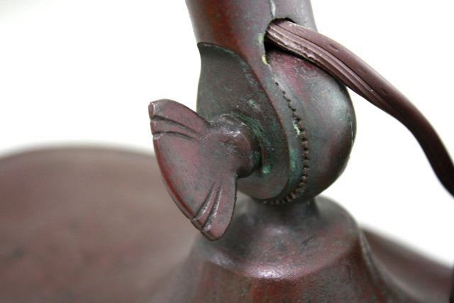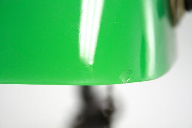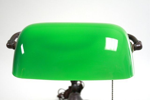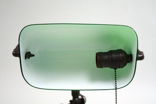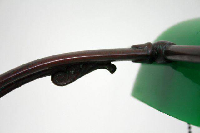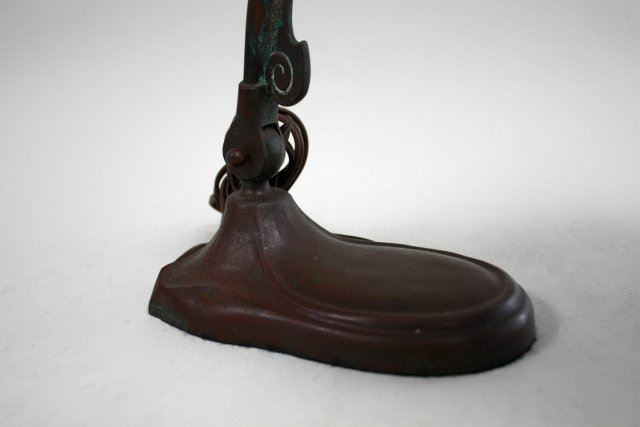 Brass. With adjustable goose-neck. Approx. 11" H. Chip to one corner & minor flaking to back of shade.