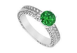 A forest-green round emerald is prong-set in the center. The band is enhanced with the intricate leaf motif. Made in 14K white gold this ring has a total weight (TGW) of 0.50 ct.