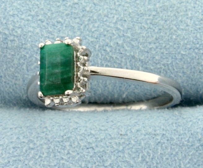 Genuine Emerald gemstone ring. Emerald is emerald cut, measures 4x6mm, and is approx. 0.60ct. Set in Platinum over Sterling Silver, size 7. 1.7g