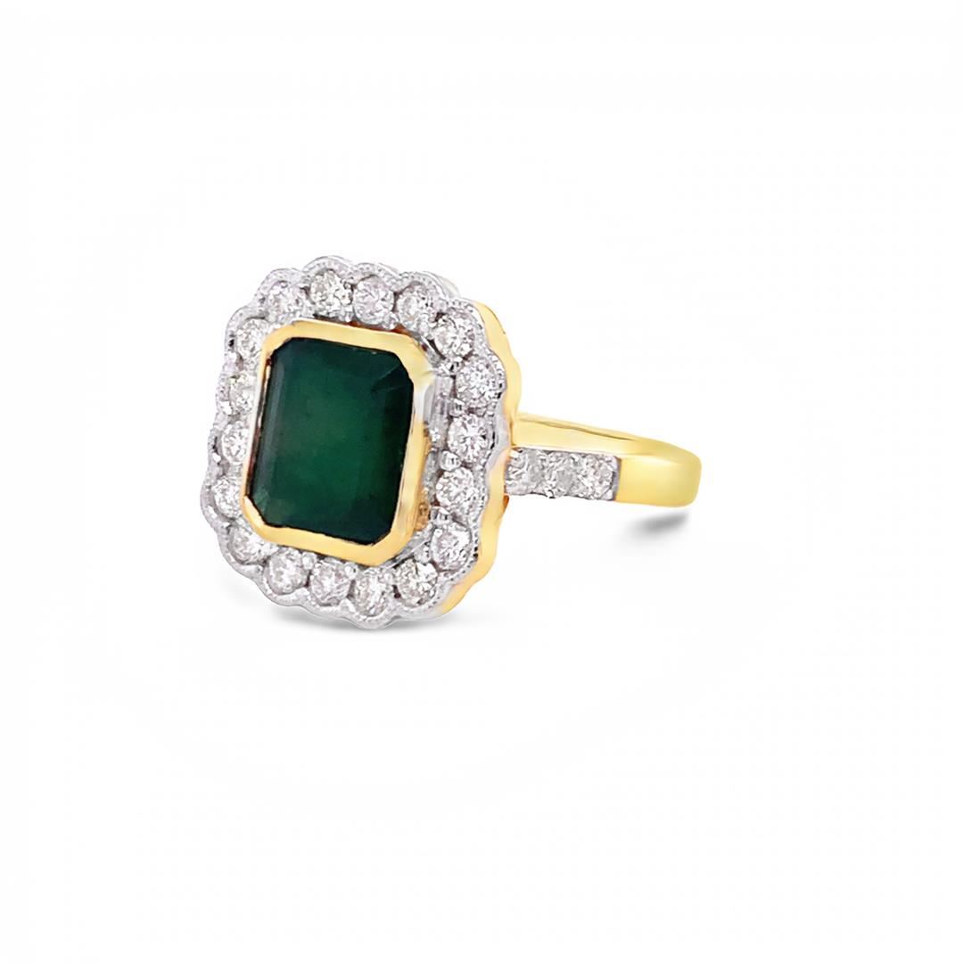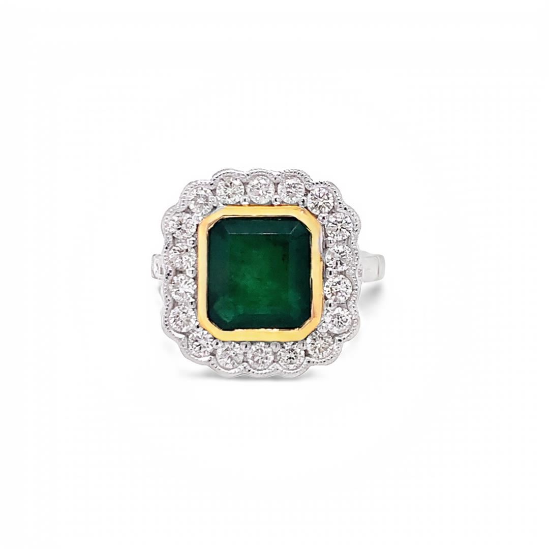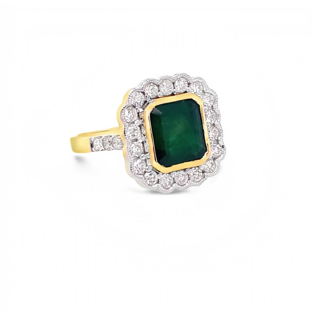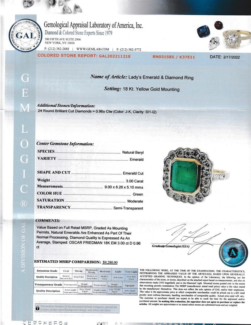 Emerald Ring. Please see Photos and Description for all available information. This vintage style Emerald Ring is set with an emerald center stone weighing 3.00 ct, surrounded by a halo of .96 cts of diamonds set in 18kt yellow gold.
