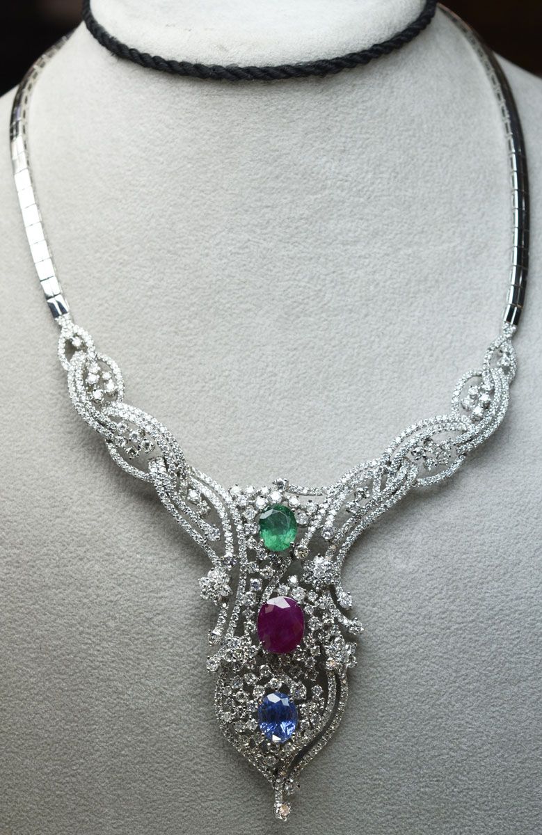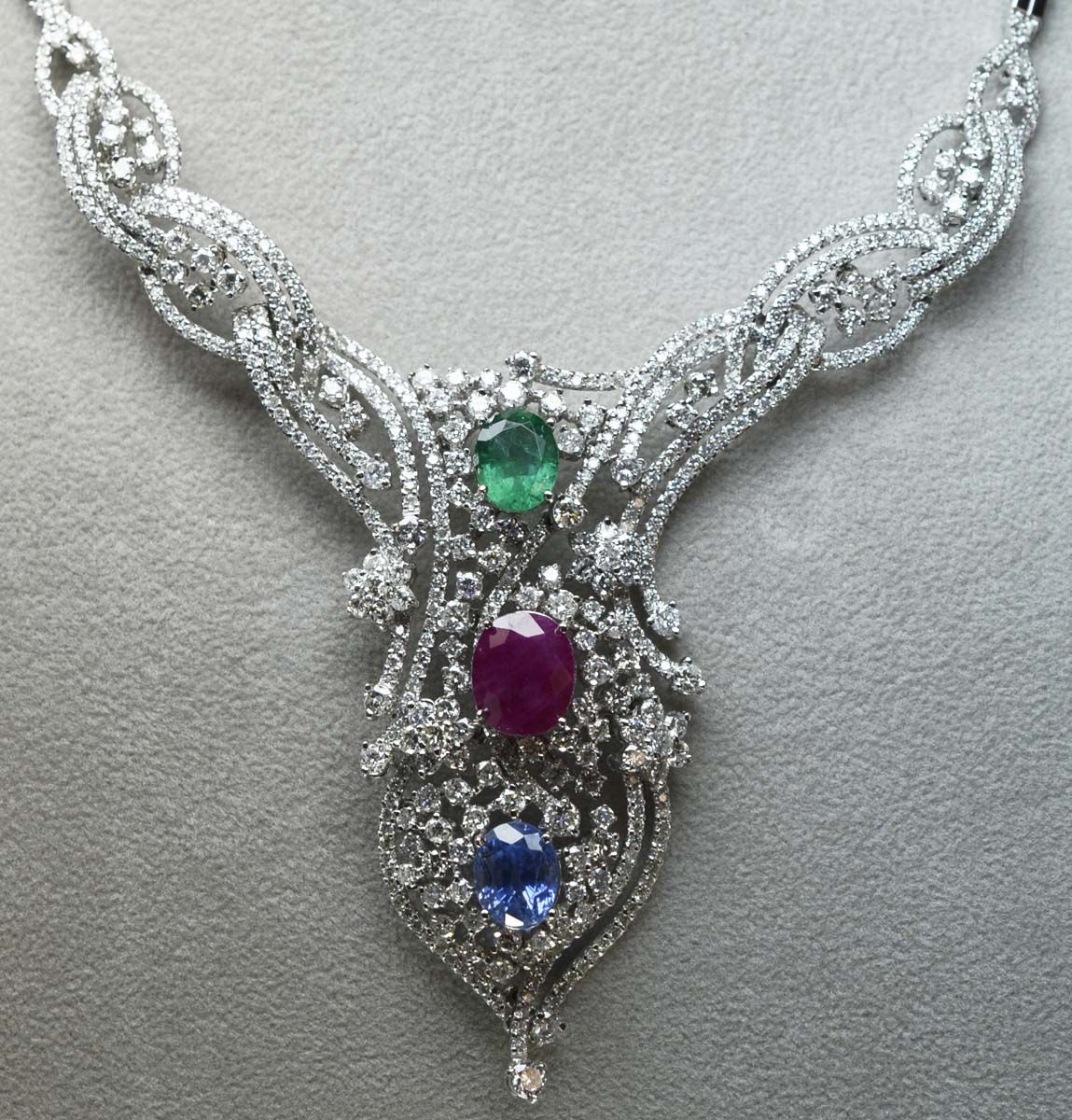 14kt White Gold 44.74 Approx grams including, 12.39cttw Rund Diamond G-H color VS-SI clarity, 5.01ct Oval Nat. Ruby, 4.15ct Oval Ceylon Blue Sapphire, 2.40ct Oval Emerald, Big Necklace, Appraised Retail Value$200000.00