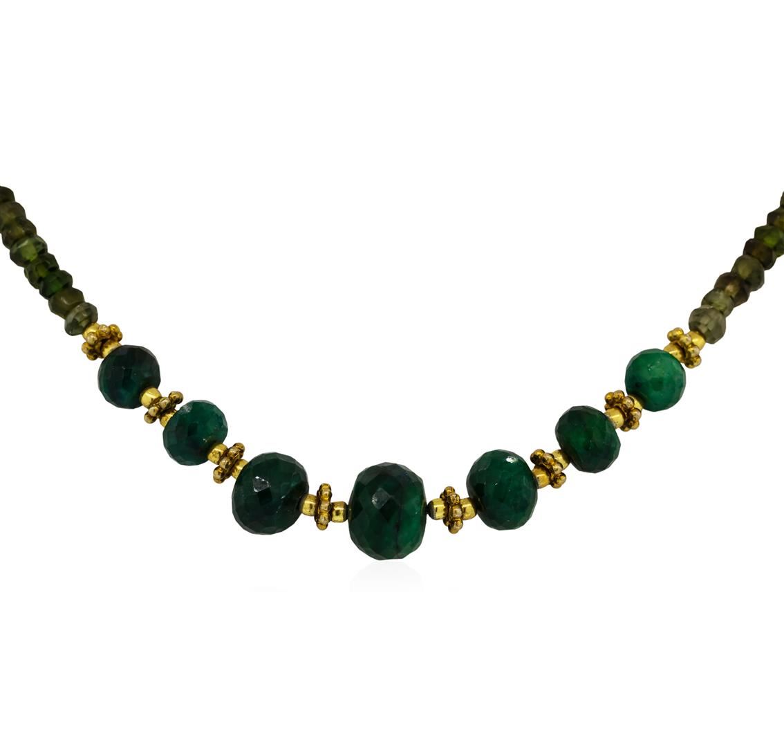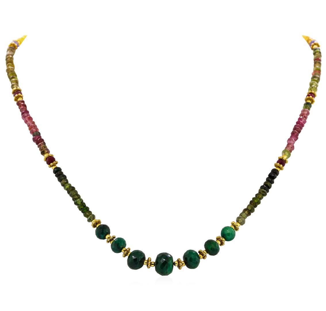 One Faceted graduated necklace weighing 15.6gm containing emerald, ruby and sapphire measuring 18 inches