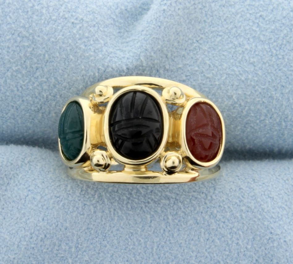 This 14K yellow gold ring contains a 9mm sapphire, 8mm emerald, and 8mm ruby. All cabochon cut with unique design etched in them. Size 7 1/2 3.9g