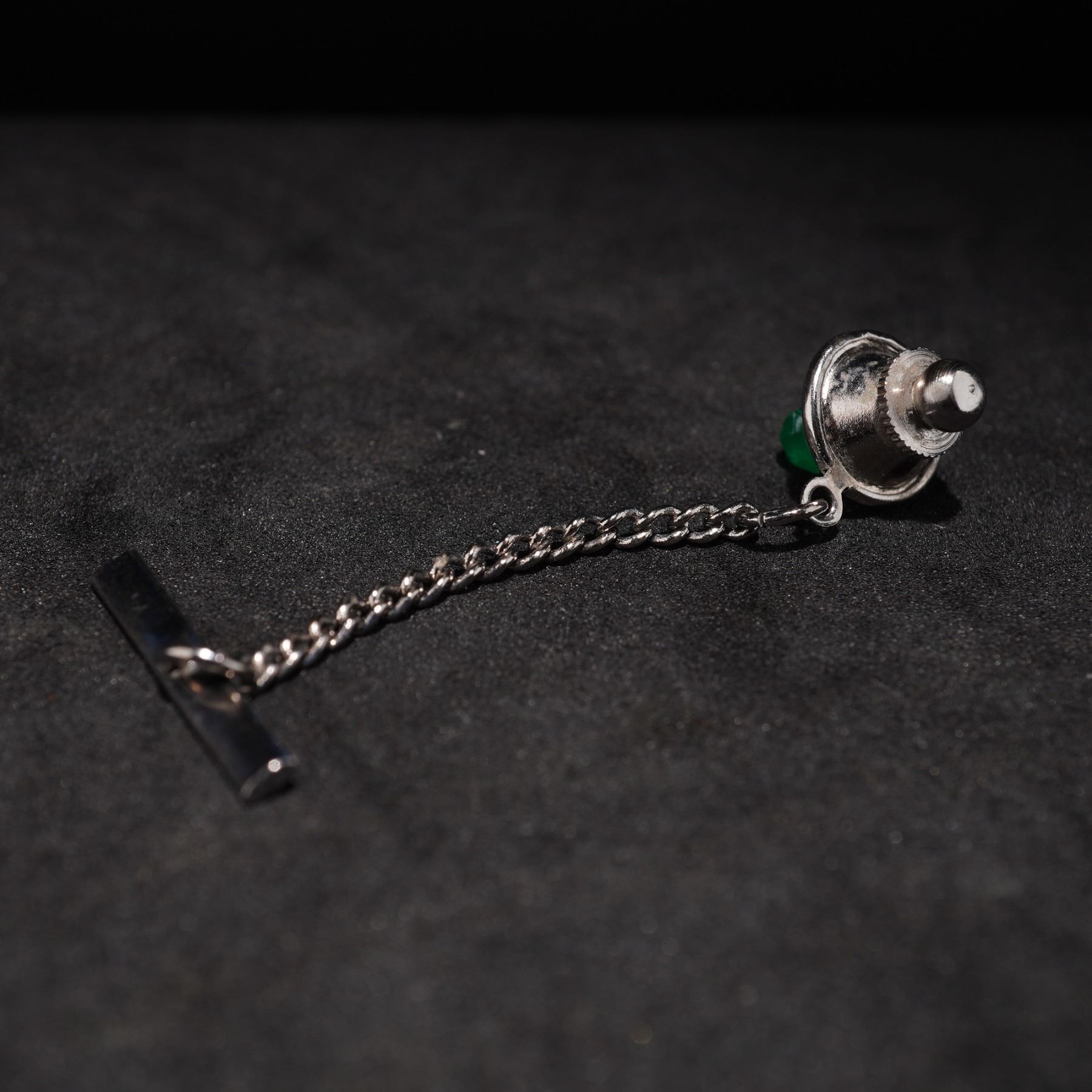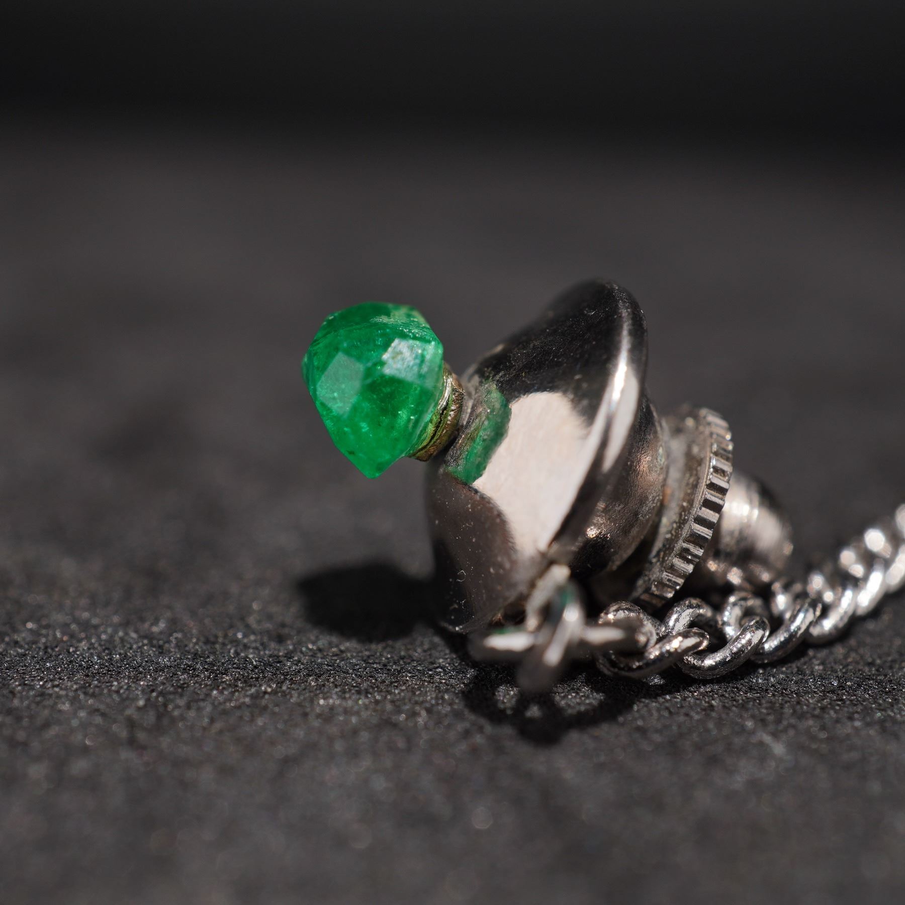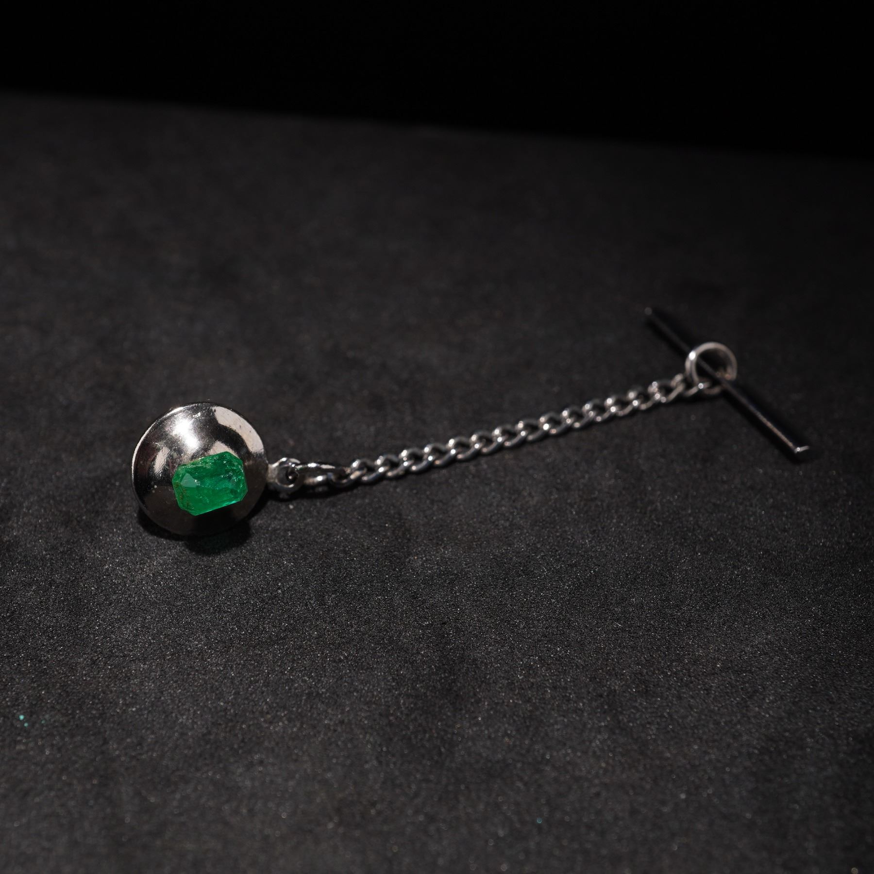 Silver-tone metal tie tack set with a faceted emerald showing surface-reaching inclusions. The stone displays natural internal features visible under magnification. Attached chain and bar fitting in matching finish. Weight: 2.3 g. Estate of Charles H. McCollister, a world traveler known for his connections with notable figures.