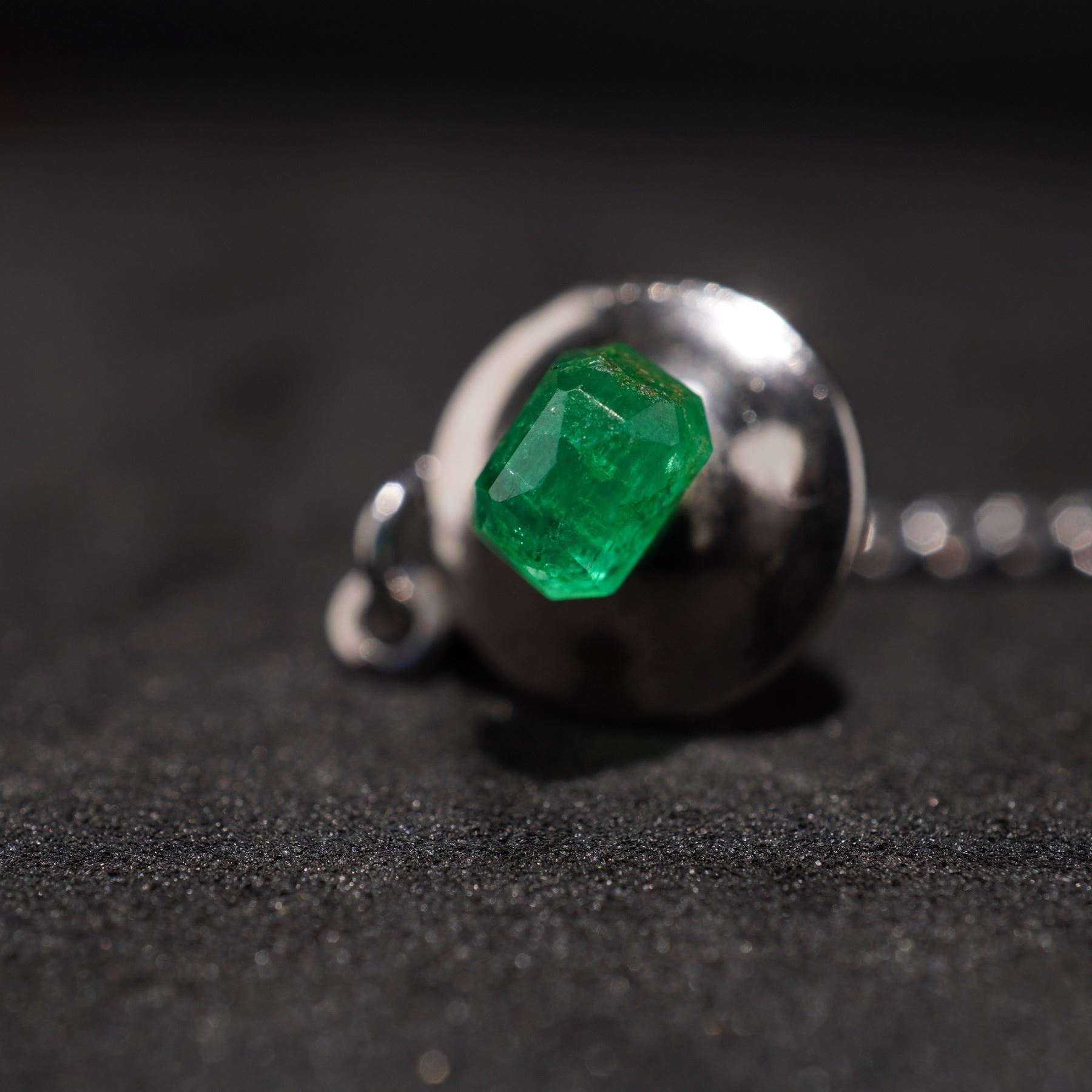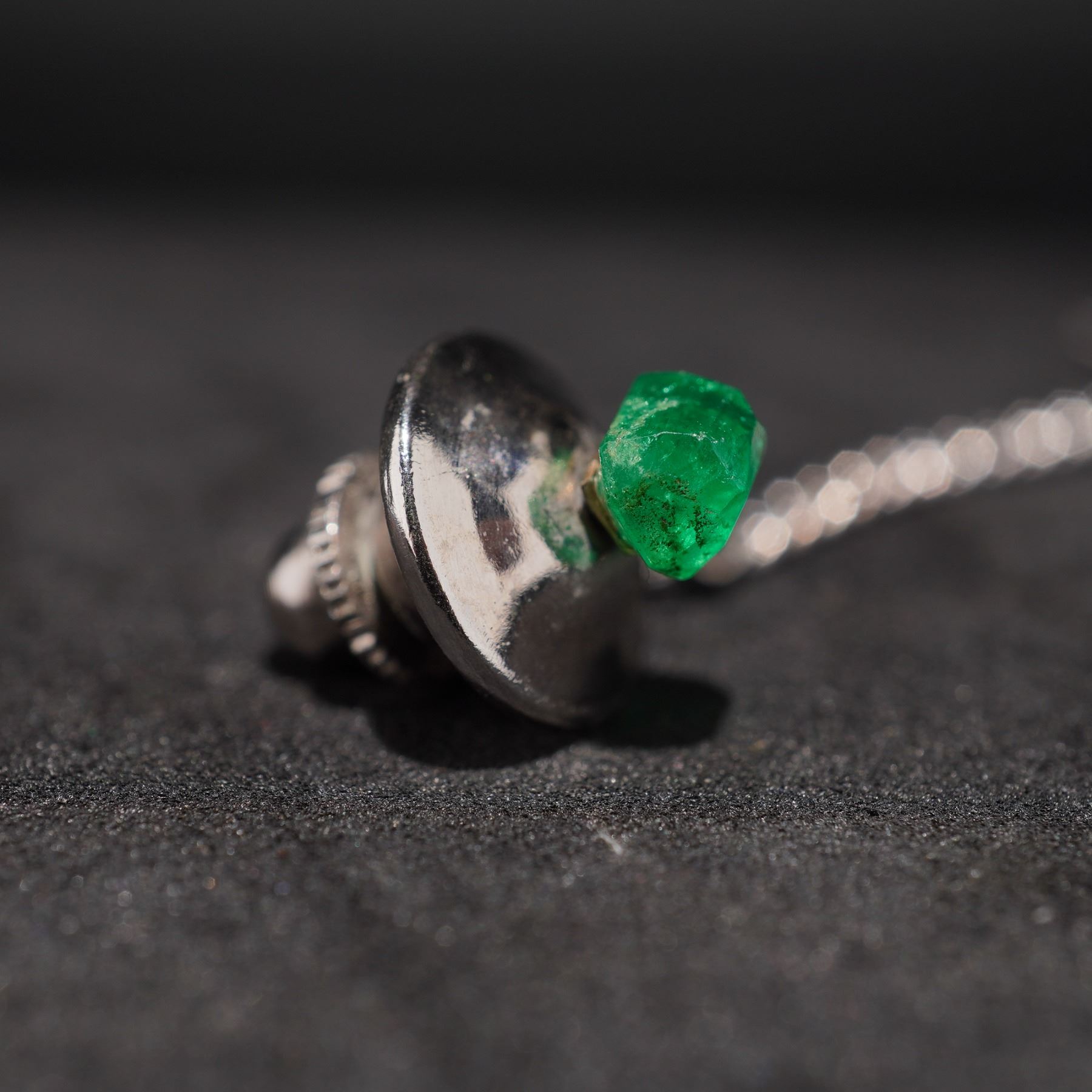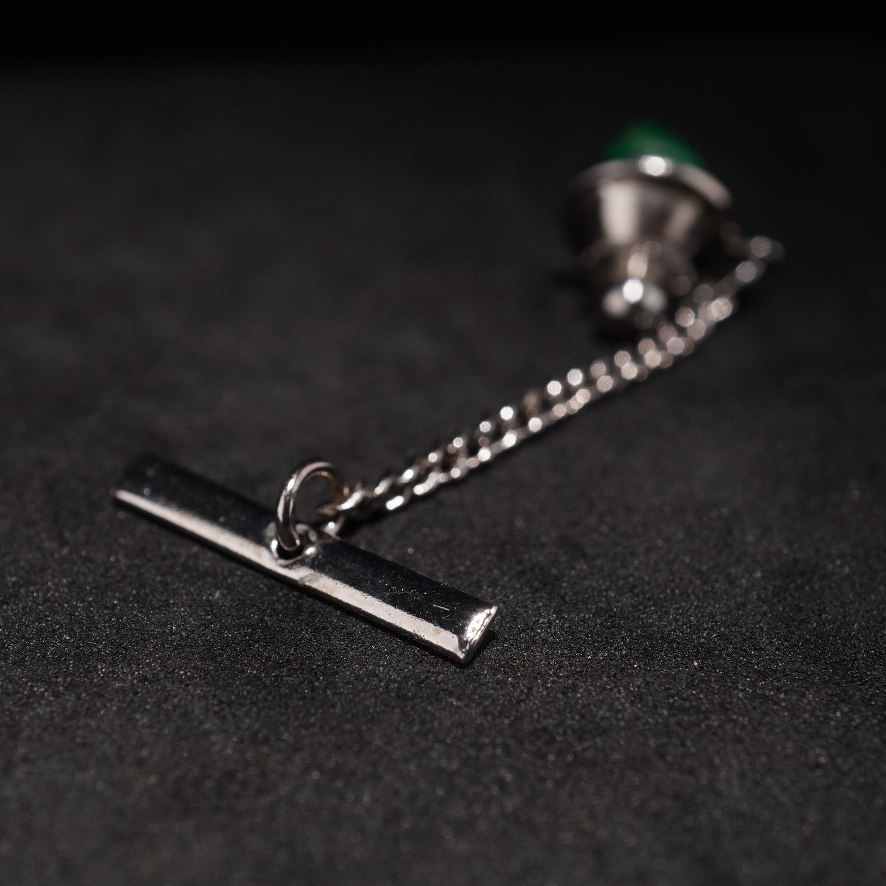 Silver-tone metal tie tack set with a faceted emerald showing surface-reaching inclusions. The stone displays natural internal features visible under magnification. Attached chain and bar fitting in matching finish. Weight: 2.3 g. Estate of Charles H. McCollister, a world traveler known for his connections with notable figures.