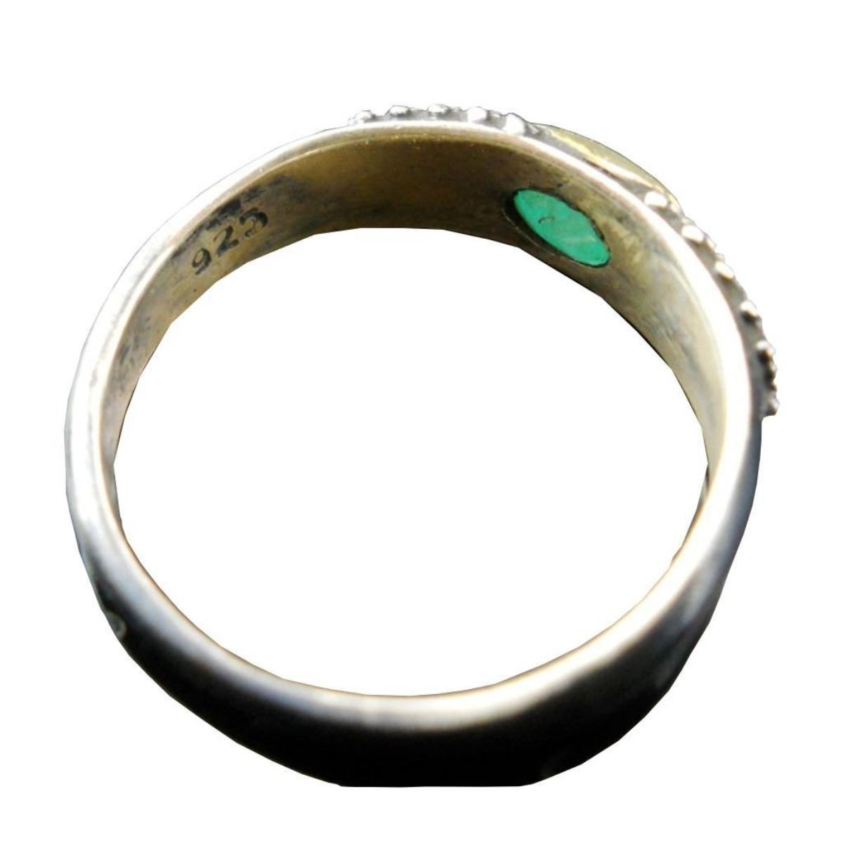 Natural 6X4mm oval faceted emerald, set into a sterling silver band. Size 7.5.