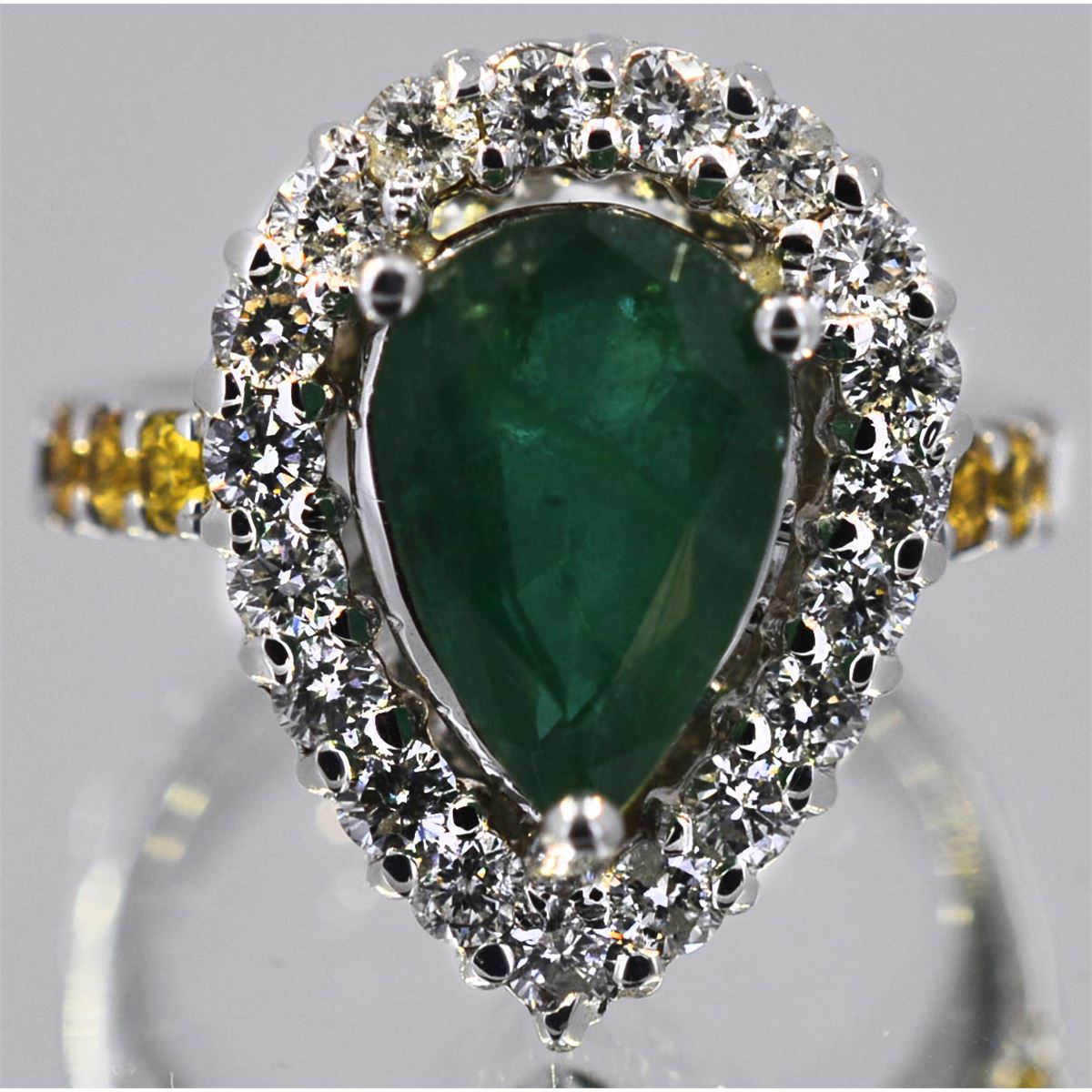 14kt White Gold 6.90 Approx grams including, 3.10ct Nat Emerald Excellent Pear Shape Deep Green, .30ctw Round Yellow Sapphire, .90ctw Round Diamond G-H color VS-SI clarity, size 6.5, Estimated Value $16,000.00, Appraisal will be included upon purchase