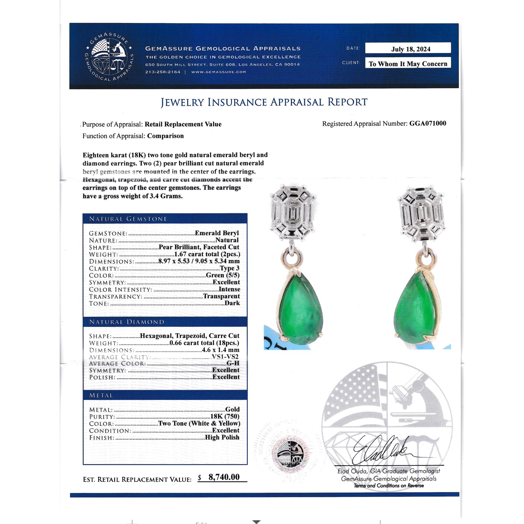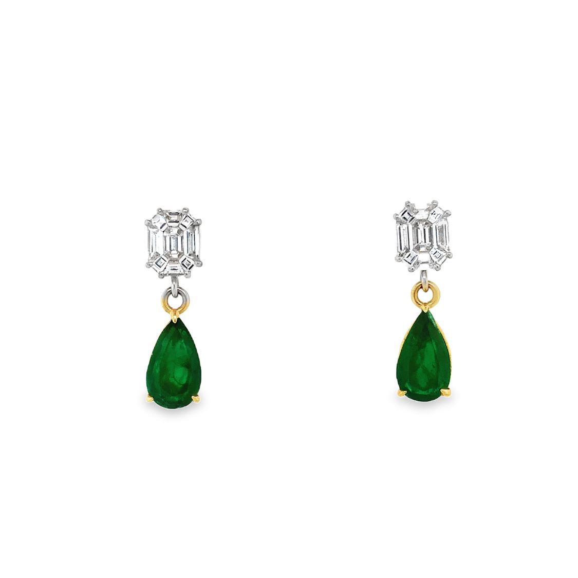 DESCRIPTION DETAIL: 18K Gold Diamond & Pear-Shaped Emerald Dangle Earrings