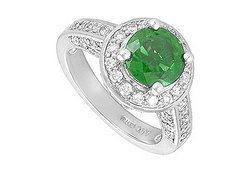 A lush green round emerald is prong-set atop. Brilliant-cut round diamonds compliment the center stone on all sides in the delicate gallery work. Made in 14K white gold this engagement ring has a total gem weight (TGW) of 4.00 ct.