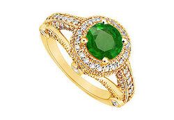 A brilliant-cut round emerald is prong-set in the center & is surrounded by smaller diamonds. Other diamonds are set on the sides too. Made in 14K yellow gold this engagement ring has a total weight (TGW) of 1.50 ct.