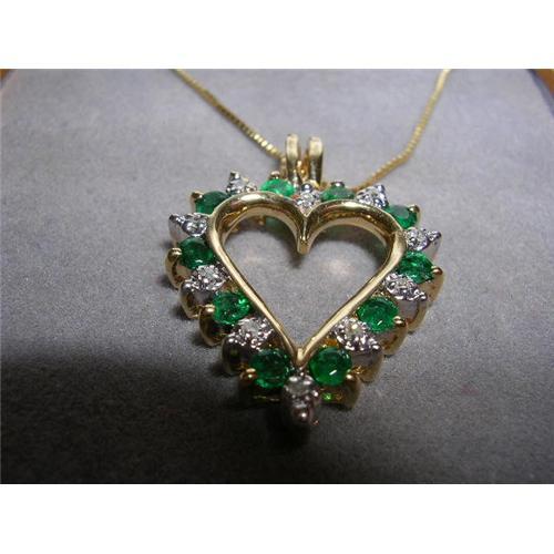 Emerald and Diamond Heart Pendant set in sturdy 10K YG. There are 10 diamonds at .01 each and 10 emeralds at .03 each for total weight of .40 carats*. The pendant comes with a 14K YG fine box chain that is 20" long. The natural emeralds have great color and are quite clear. The diamonds face up white. It is 3/4" long(23mm) from bail to bottom tip of the heart.