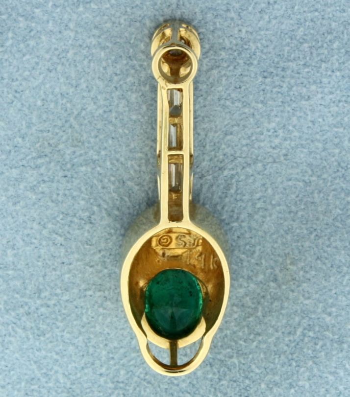 In 14k yellow gold. Contains a high quality oval shaped 1.5ct natural emerald gemstone with excellent vibrant green color. Also contains a .15ct high quality round brilliant diamond and three .15ct high quality baguette diamonds, F color/SI clarity, eye clean. 1 1/4" long with bale. 5.5g.