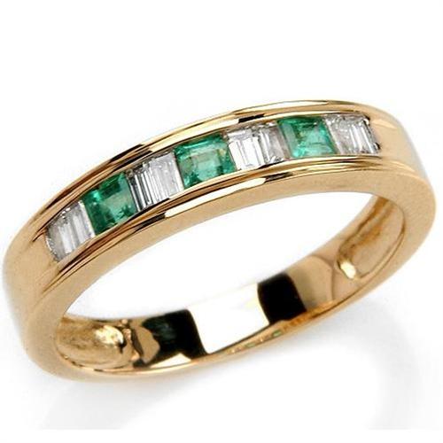 Size 7---Three princess cut, .18ctw. natural emeralds and eight baguette cut, .16ctw. diamonds are channel set in this 14kt. yellow gold ring. The diamonds are SI1-SI2 in clarity.