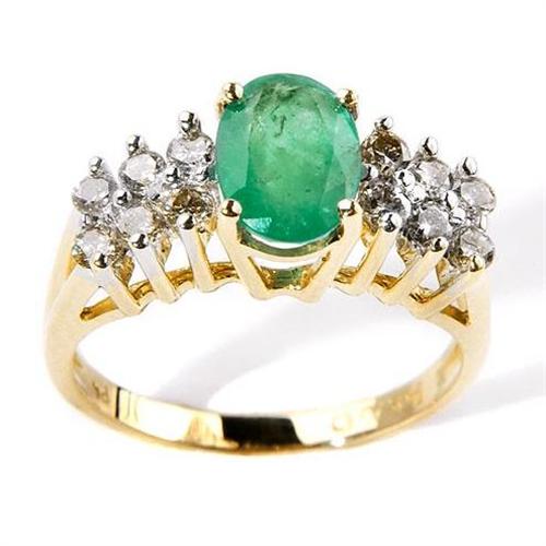 Size 6.75---14kt. yellow gold holds one 1.20ct. natural emerald and twelve .50ctw. diamonds. The oval cut emerald is a rich green and the round brilliant cut diamonds are SI2-I1 in clarity.