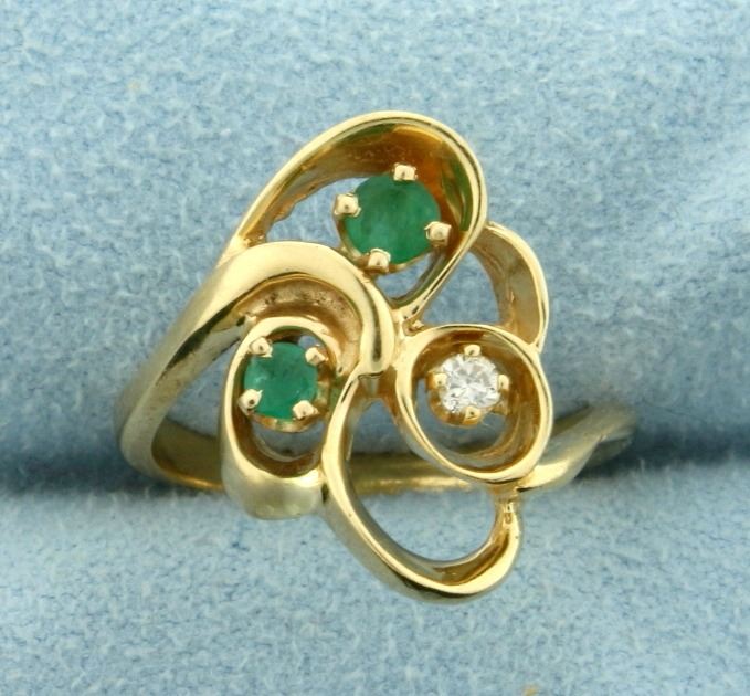 In 14K Yellow Gold. Contains two high quality natural Emerald gemstones - one 3.5mm and the other 3mm, both with a bright emerald green color. Also contains a .05ct high quality Diamond, SI clarity/H color. Size 6 1/2. 4.6g