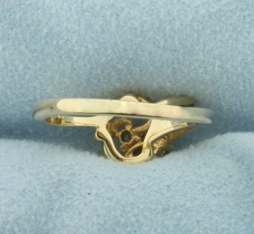 In 14k yellow gold. Contains a high quality .03ct round diamond, VS clarity/I color, and two natural 6x3mm marquise cut emerald gemstones with deep green color. Small chip in on emerald under prong, not noticeable even with magnification. Size 5. 2.7g.