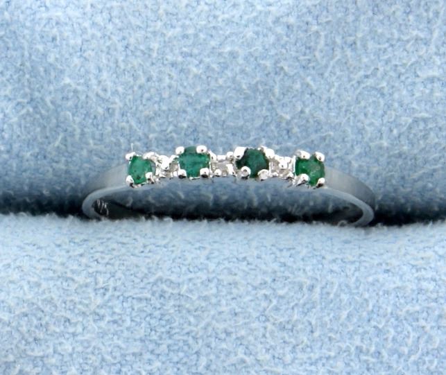 Contains 0.15 carats of Genuine Emerald gemstones and one 0.01 ct Diamond, set in platinum over sterling silver. Size 7.25. 0.9g.