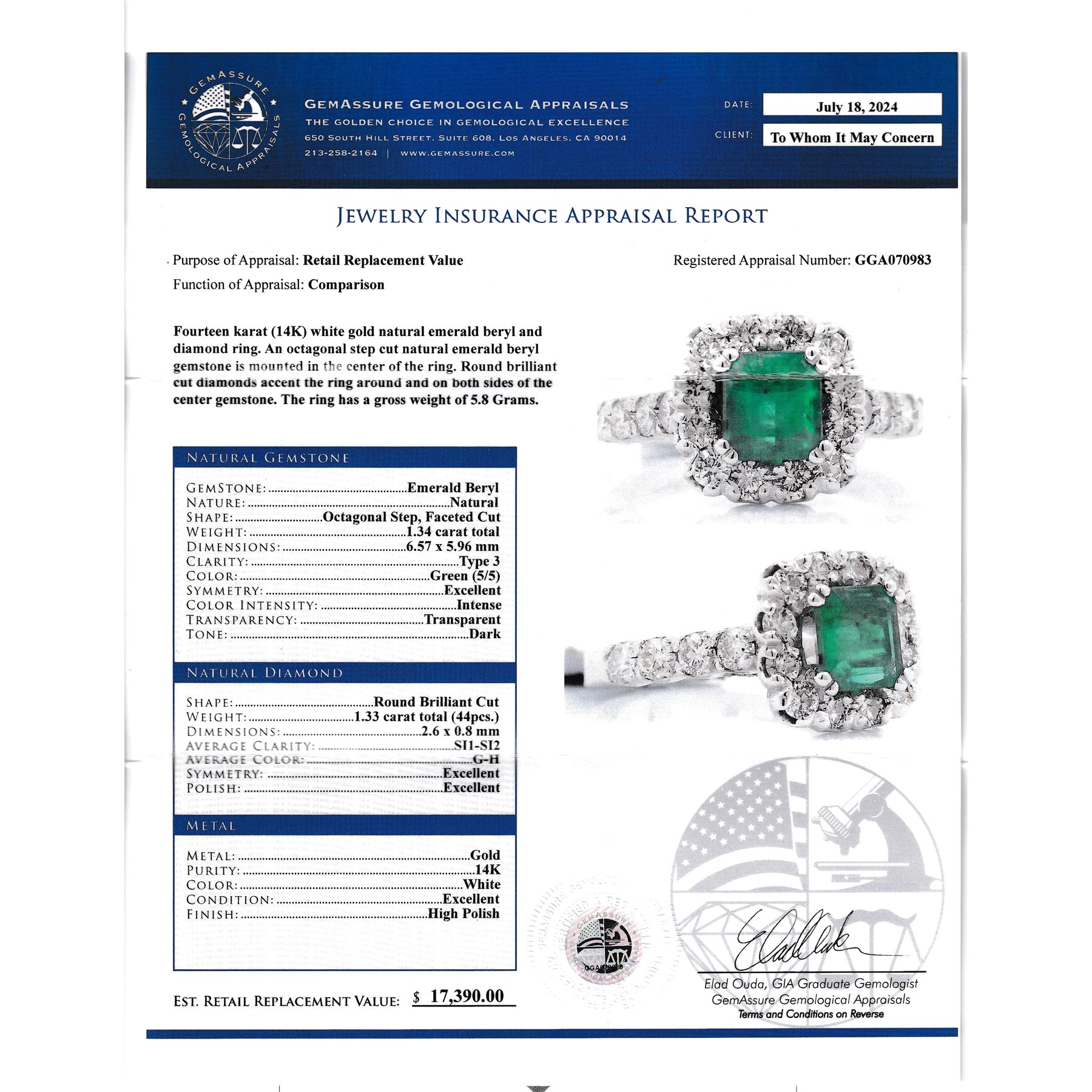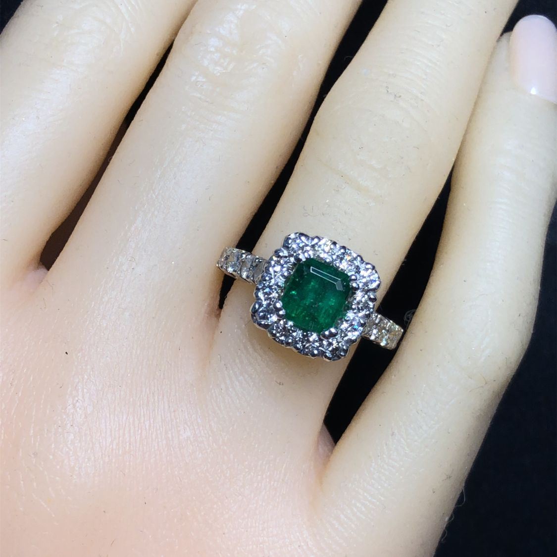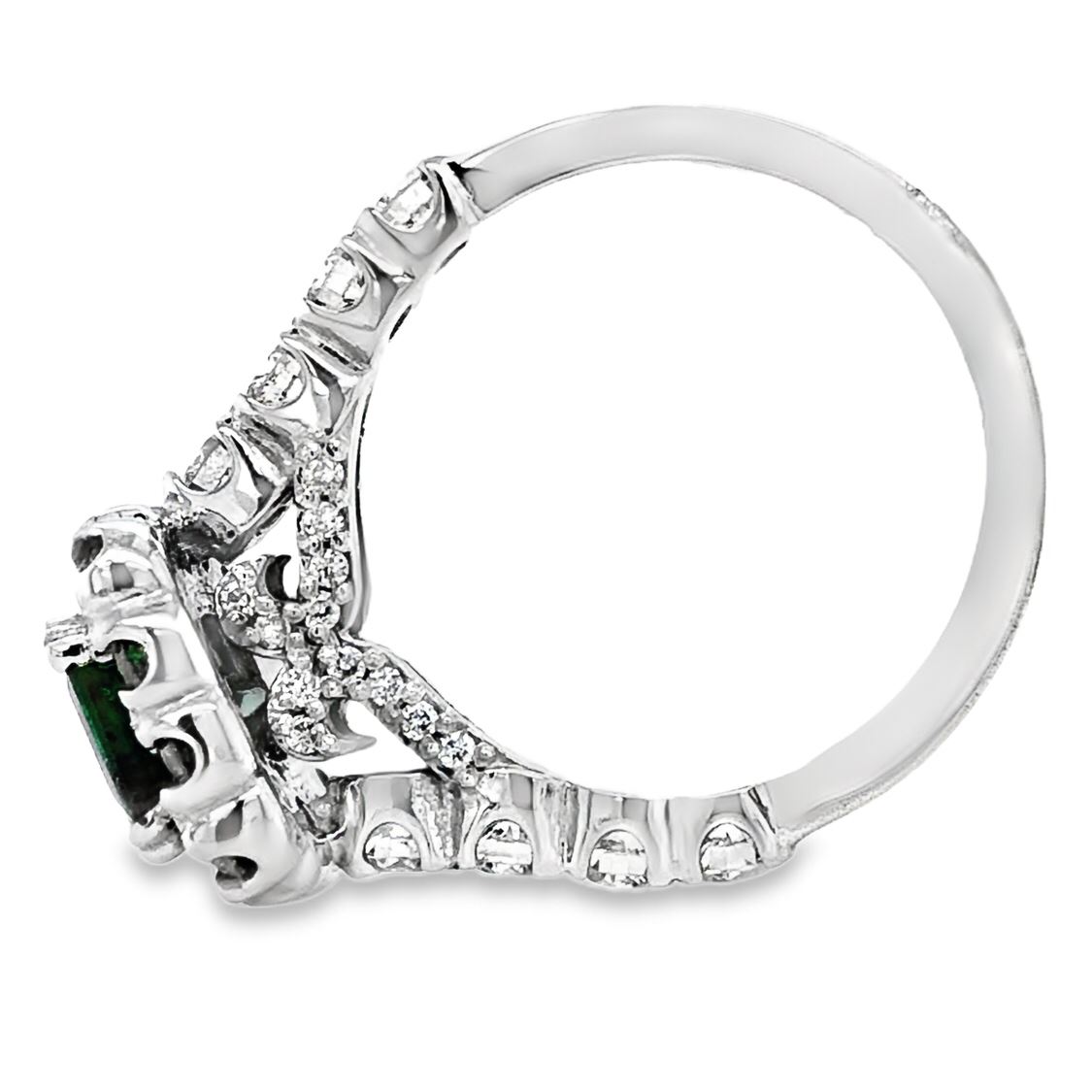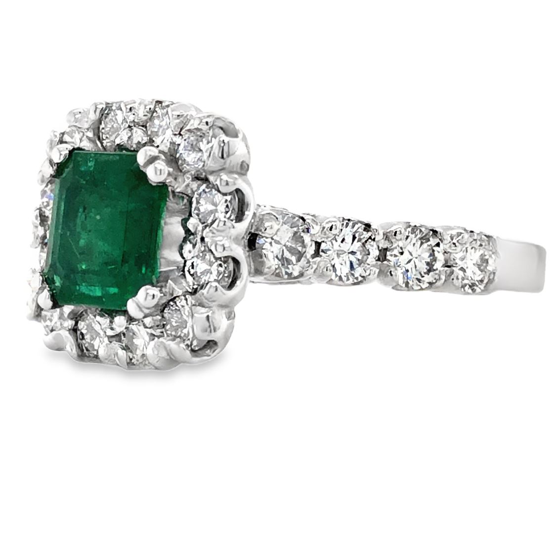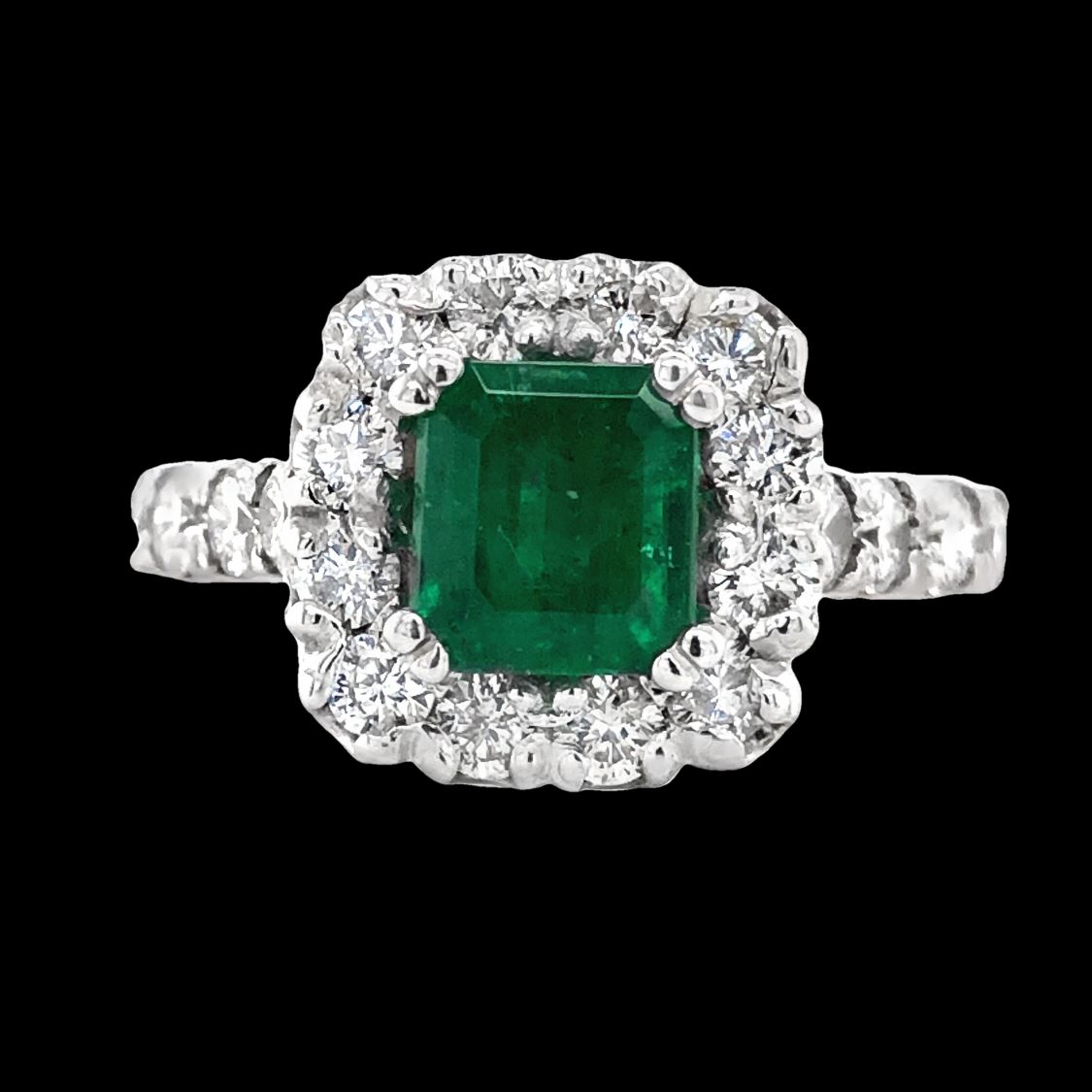 DESCRIPTION DETAIL: A beautiful ring featuring an emerald cut Emerald surrounded by round brilliant cut natural Diamonds set in 14k White Gold.