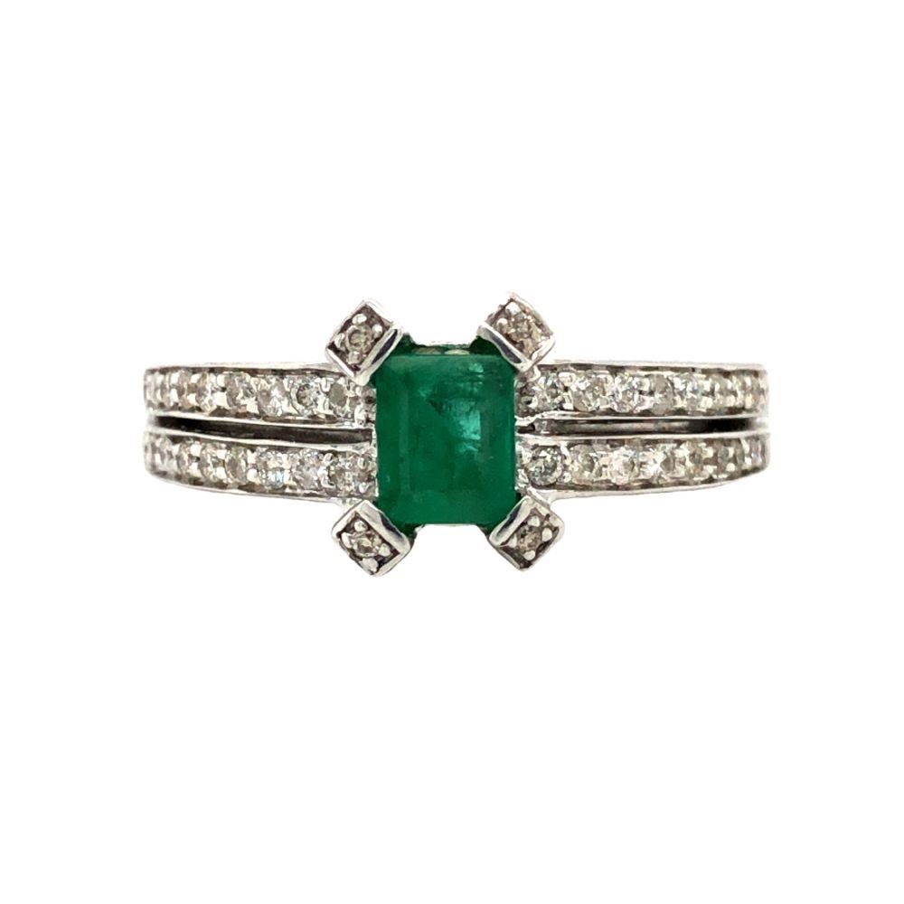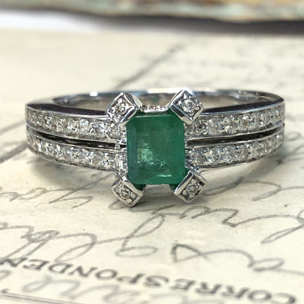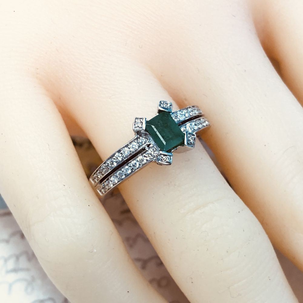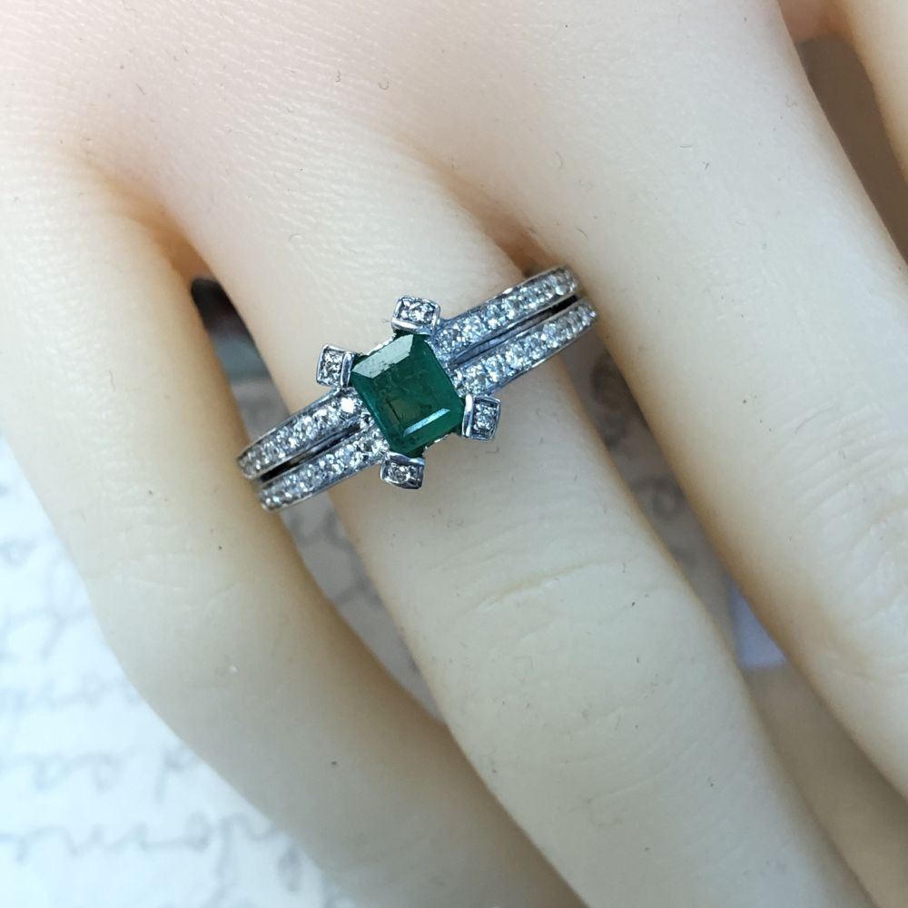 TITLE DESCRIPTION: Emerald and Diamond Split Shank Unity Ring