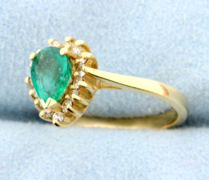 Great Emerald and diamond Halo style ring set in 14k yellow gold. The Emerald weighs 0.80 carats and is a great pear shape. The emerald color is a deep green color and we believe it to be of Zambian origin. There are 15 brilliant cut diamonds that weight 1/2 ct. Diamonds are high quality SI clarity and H color. Size 6 3.6g
