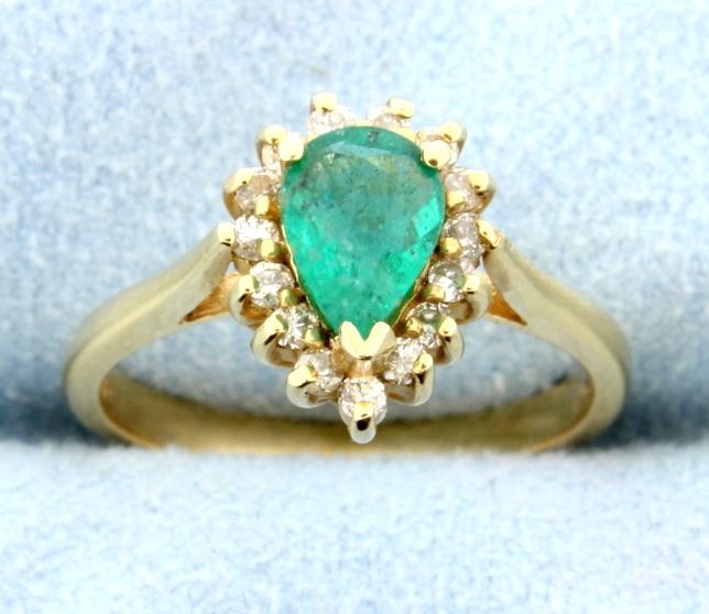 Great Emerald and diamond Halo style ring set in 14k yellow gold. The Emerald weighs 0.80 carats and is a great pear shape. The emerald color is a deep green color and we believe it to be of Zambian origin. There are 15 brilliant cut diamonds that weight 1/2 ct. Diamonds are high quality SI clarity and H color. Size 6 3.6g