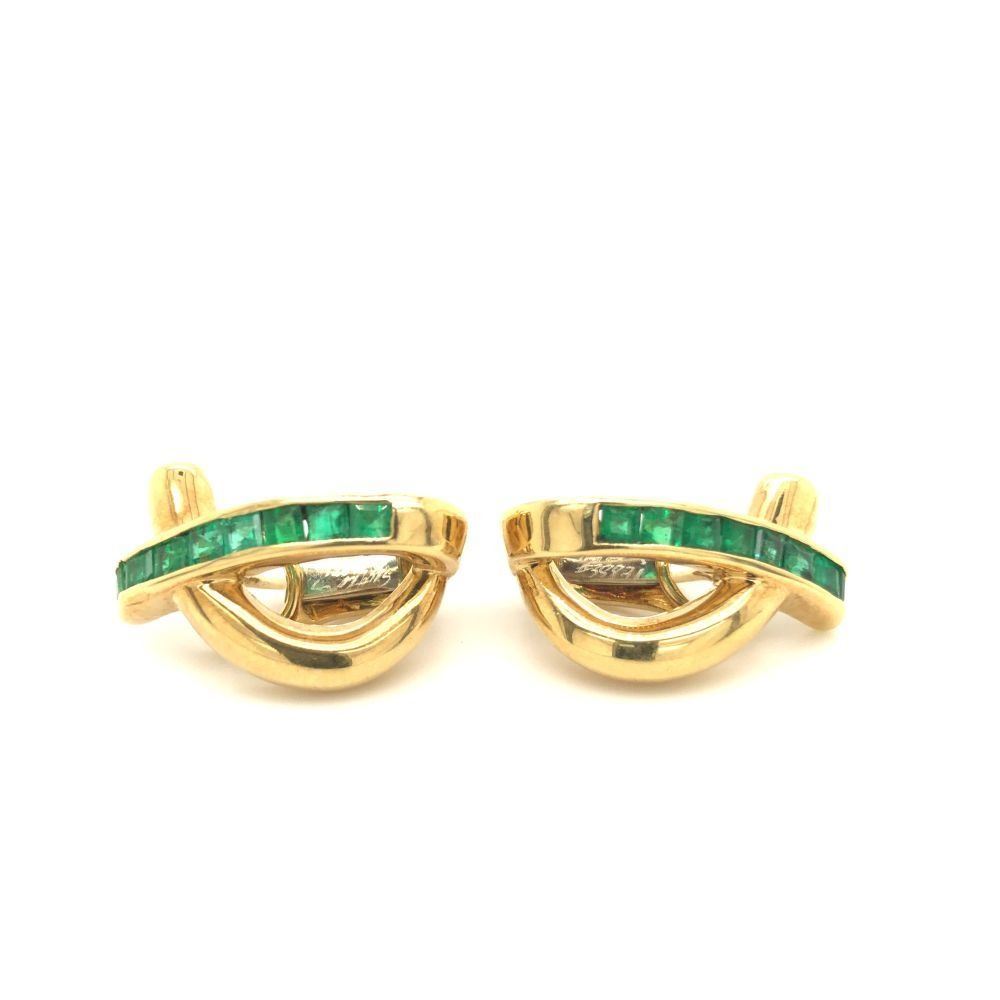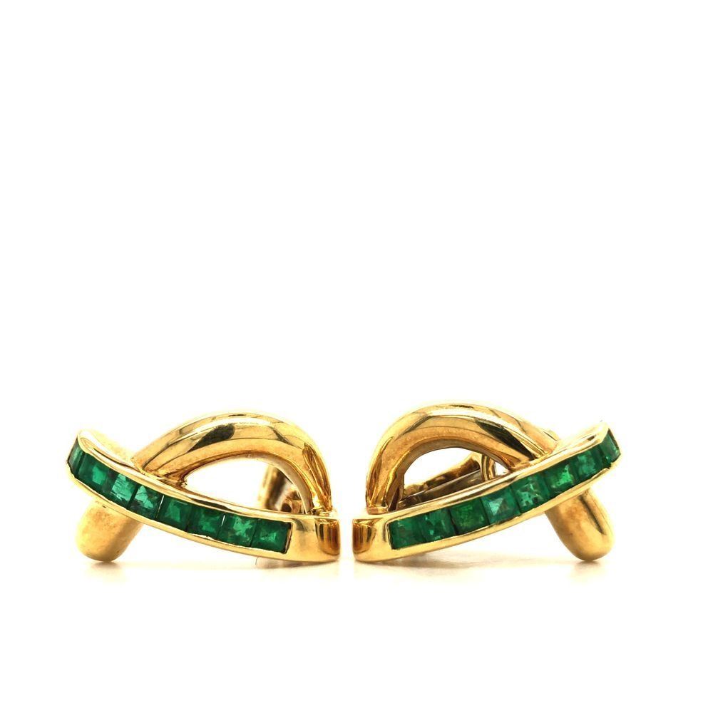 Genuine Emerald Earrings. This is a pair of 18 karat yellow gold genuine emerald earrings. The approximate .64 carats of square-cut vivid green emeralds are channel set and the earrings are an attractive loop design. They are approximately 3/4& quot; diameter and have Omega backs. These earrings are certified and appraised for $3,750.00 marketable cash value. This is a preowned, estate item in excellent condition.