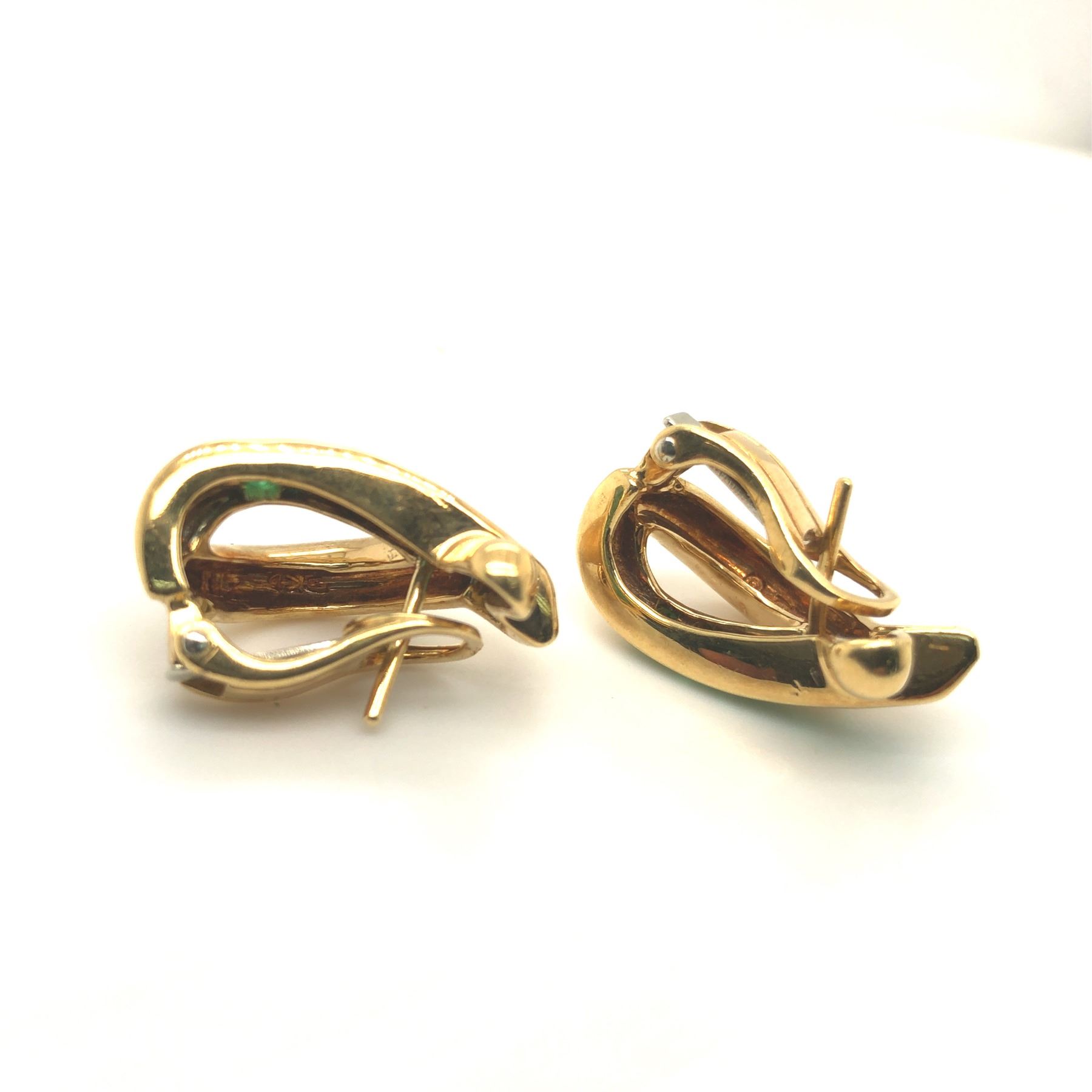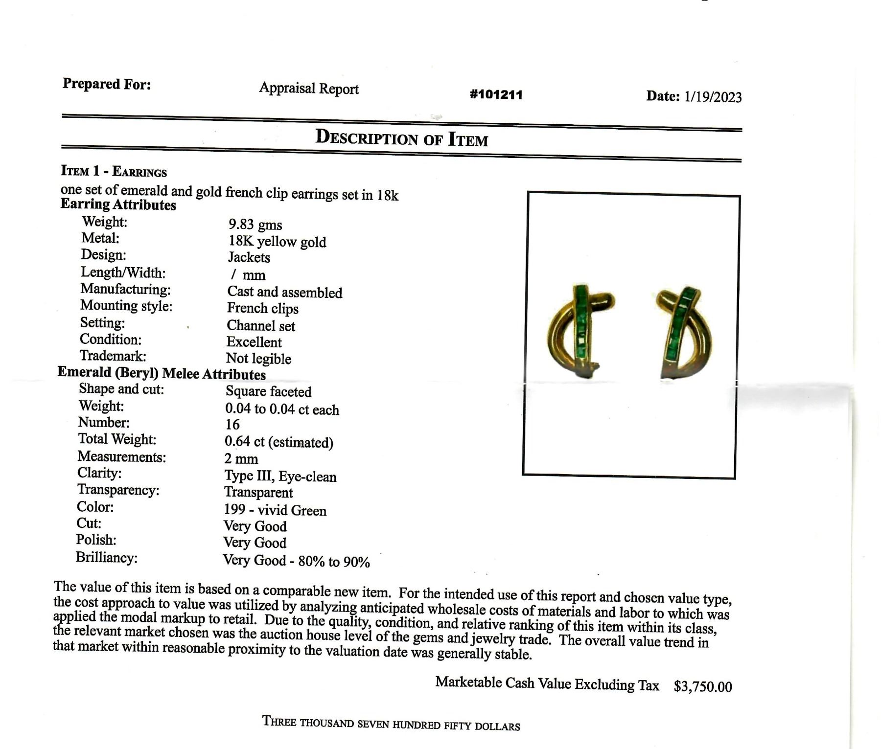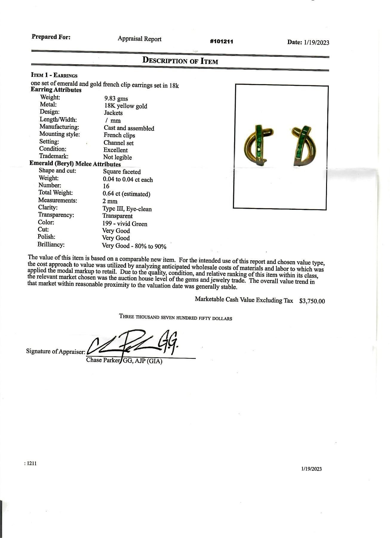 Genuine Emerald Earrings. This is a pair of 18 karat yellow gold genuine emerald earrings. The approximate .64 carats of square-cut vivid green emeralds are channel set and the earrings are an attractive loop design. They are approximately 3/4& quot; diameter and have Omega backs. These earrings are certified and appraised for $3,750.00 marketable cash value. This is a preowned, estate item in excellent condition.